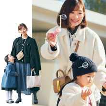 「華やかな総柄がネイビーパーカのカジュアルな装いにアクセントに。スマートな見た目に反してたっぷりな容量サイズが公園シーンでも大活躍の予感です! 1.次男のミニカーと恐竜、長男の縄跳びを入れた公園用ポーチ。2.洗うパーツが少なくて便利なハイドロフラスクのキッズボトル(354㎖)、ニット帽は防寒対策&公園内の目印にも。3.おやつはケンカになるので必ず同じものを2つずつ、自分用の焼き菓子も忘れずに(笑)。4.テネリータのタオルはバッグの中でも見つけやすい目を引くマスタードカラーがお気に入り。5.ZARA HOMEのポーチを次男のオムツ入れに。嵩張るオムツポーチも余裕で入りました!6.公園の時はお財布を持たずにスマホのみ。cache cacheのバッグについていたハンドリングをスマホケースに付けています。」大和美帆さん(VERY STOREバイヤー/長男6歳・次男2歳)