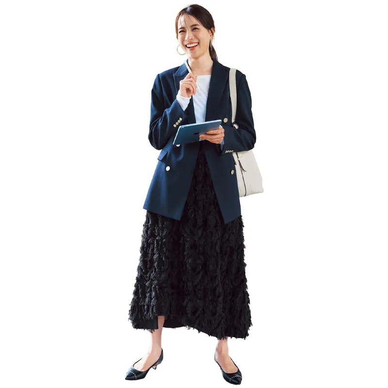 白ロンTを白シャツ代わりにインしたお仕事シーンのコーデ。ロンTのカジュアル要素でカッチリ感を引き算し、ジャケットコーデを調整します。下半身のボリュームスカートとのバランスも絶妙に。パンプスやバッグはきちんとカラーであくまでもビジネスのトーンを意識して。