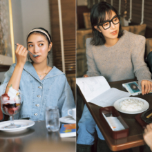 チュール素材のトップスにデニムを合わせた、甘さとヘルシーさのバランスが絶妙な着こなし。しっかり長さのある袖口のデザインとそれにマッチするネイルが、手元の所作まで美しく演出してくれそう。ブルーデニムでカジュアルながらも小物は黒で締めることで、可愛さにほんの少しの大人っぽさをプラス。(山上梨央さん)
