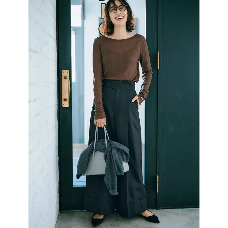 やりすぎていない透け感がデイリー使いにちょうど良いロンTはトレンドのブラウンを選んで。大人が着ても部屋着感が出ないのは、小技が効いたデザインゆえ。長めの袖、ボートネック、計算されたリブデザインで、太めパンツと合わせただけでもこなれた印象に。袖を際立たせるバングルをロンTの上からつけた上級者っぽいアクセ合わせで、気取らないのに洒落ているコーデの完成です。