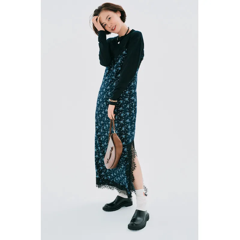 レースや花柄など、足し算要素が多いキャミワンピと合わせるなら、シンプルな黒ロンTがしっくり。動きやすさも忘れない甘カジスタイルの完成です。全身のトーンを黒に統一して縦のラインをつくることで、柄ワンピも大人仕様に。