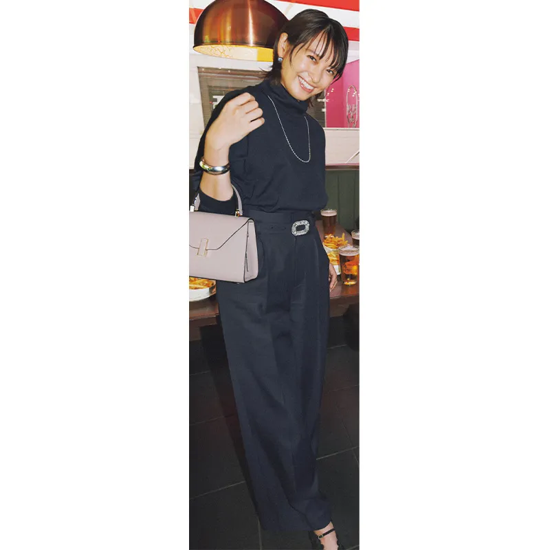 ずっと着ていたくなるような柔らかな肌触りのワザありロンTは、疲れが出た日のために1枚は持っておきたいところ。シンプルに見えるけど、くしゅっと長めの袖や首元の効果で抜け感のある今どきニュアンスに。黒パンツと合わせてダークトーンでクールにしつつ、白の細ベルトで引き締めれば、頑張らなくてもちゃんとしてる感が。