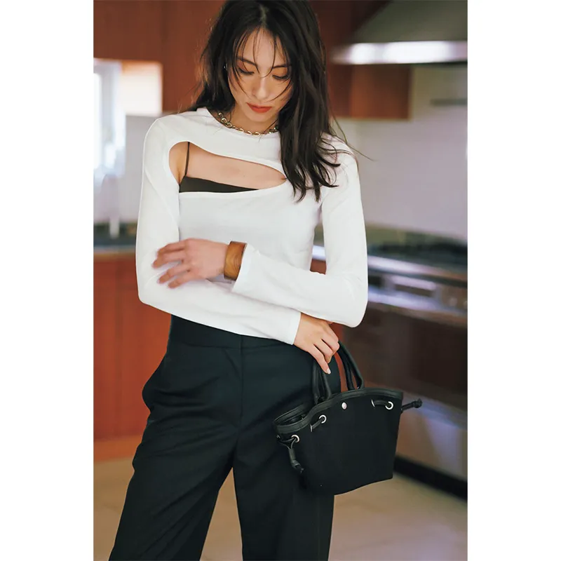 「ロンT=カジュアルすぎて普段着見え」の概念を崩す、大胆なカッティングがポイントのロンT。センシュアルな肌見せも、素材がカジュアルなものならばやりすぎ感もなく着こなせるのが良いところ。手持ちの黒パンツと合わせるだけで「普段着以上のおしゃれ」ができて、高揚感のあるコーデに。