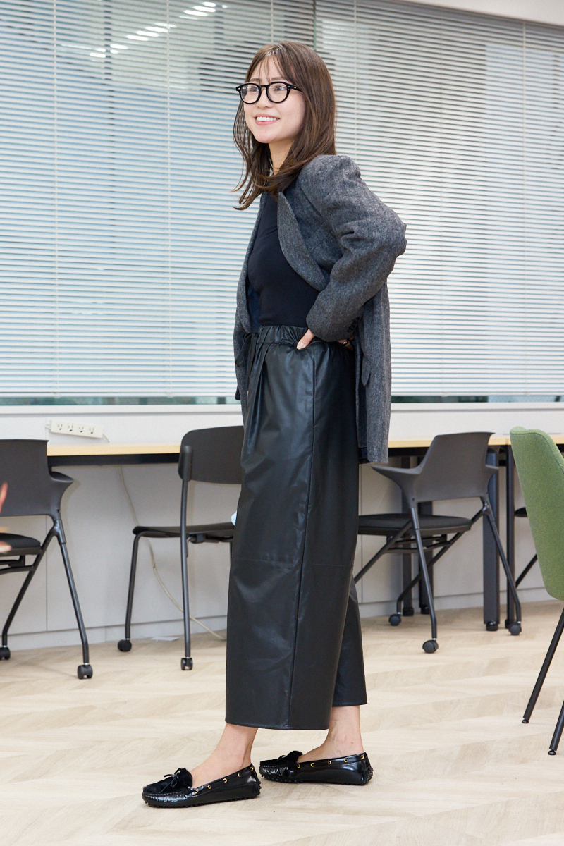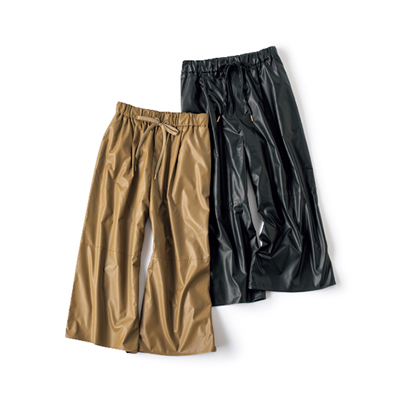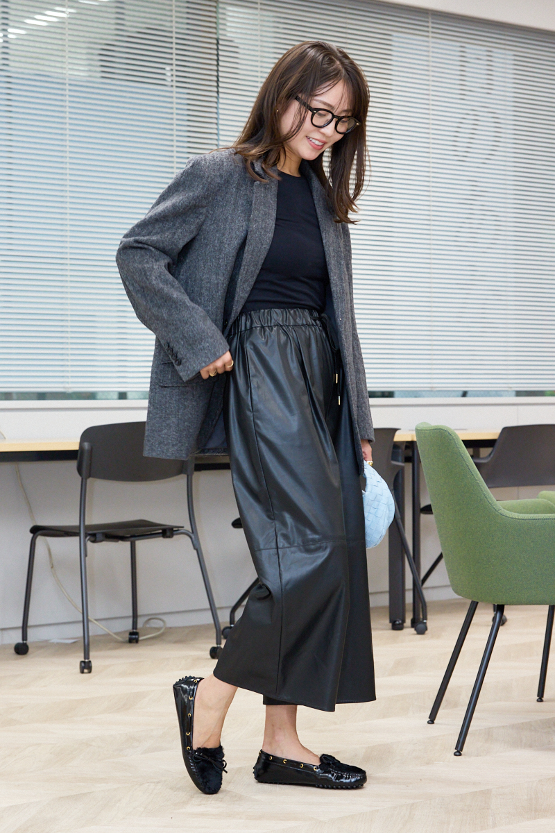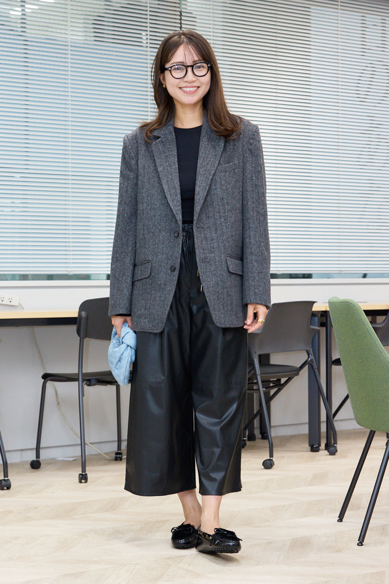 「娘のお友達のピアノの発表会には、鑑賞中もカチッと見えるようにジャケットはマスト。ボトムスは長く座っていても楽なパンツを。とにかく動きやすくてシワになりにくく、ウエストゴムでゆとりがあるから娘を膝に座らせることになっても窮屈に感じません。レザーなので穿くだけでこなれた印象を演出してくれるのに、いつものゆるパンツ感覚で取り入れられるのがうれしい!」ライター降籏咲子さん・33歳(164cm/3歳の女の子ママ)