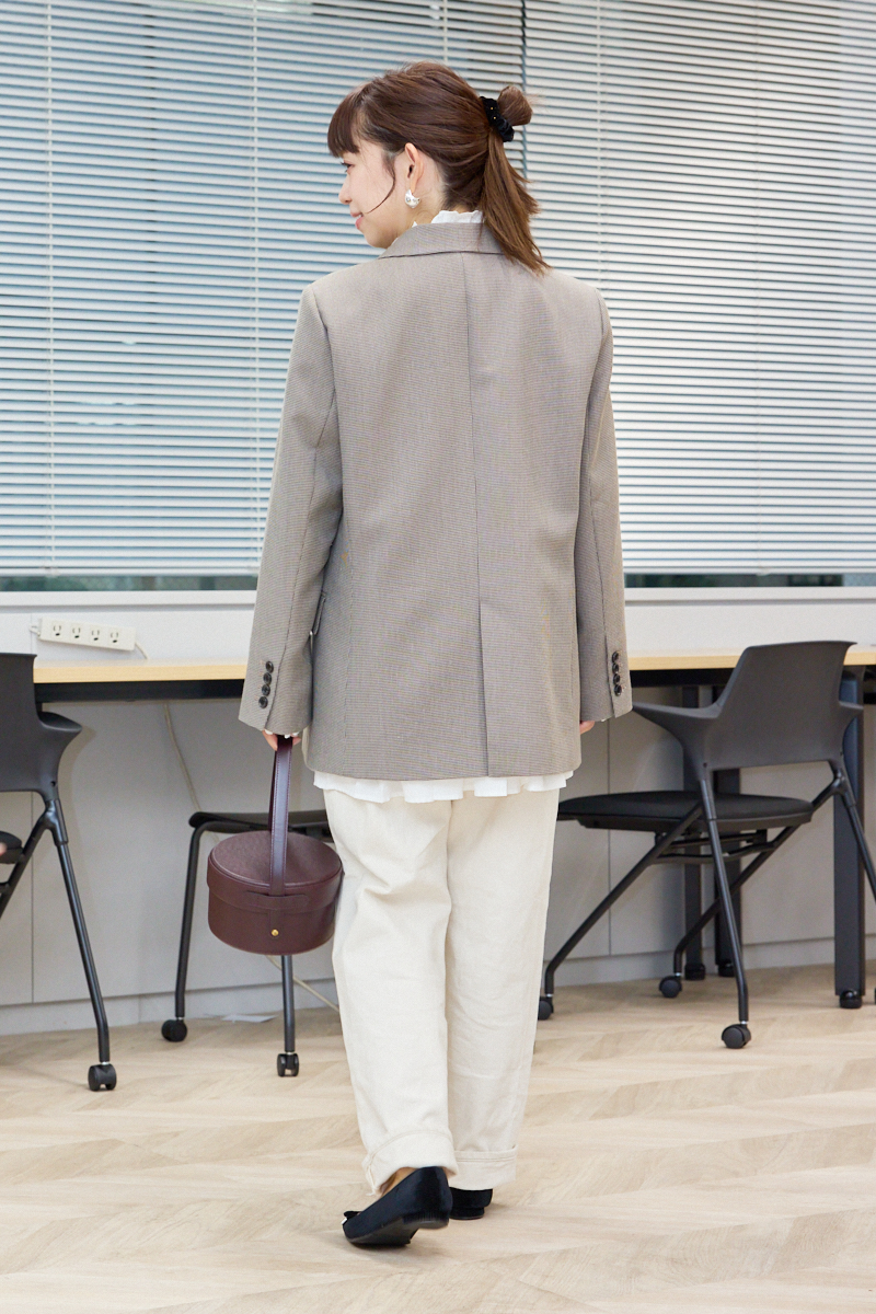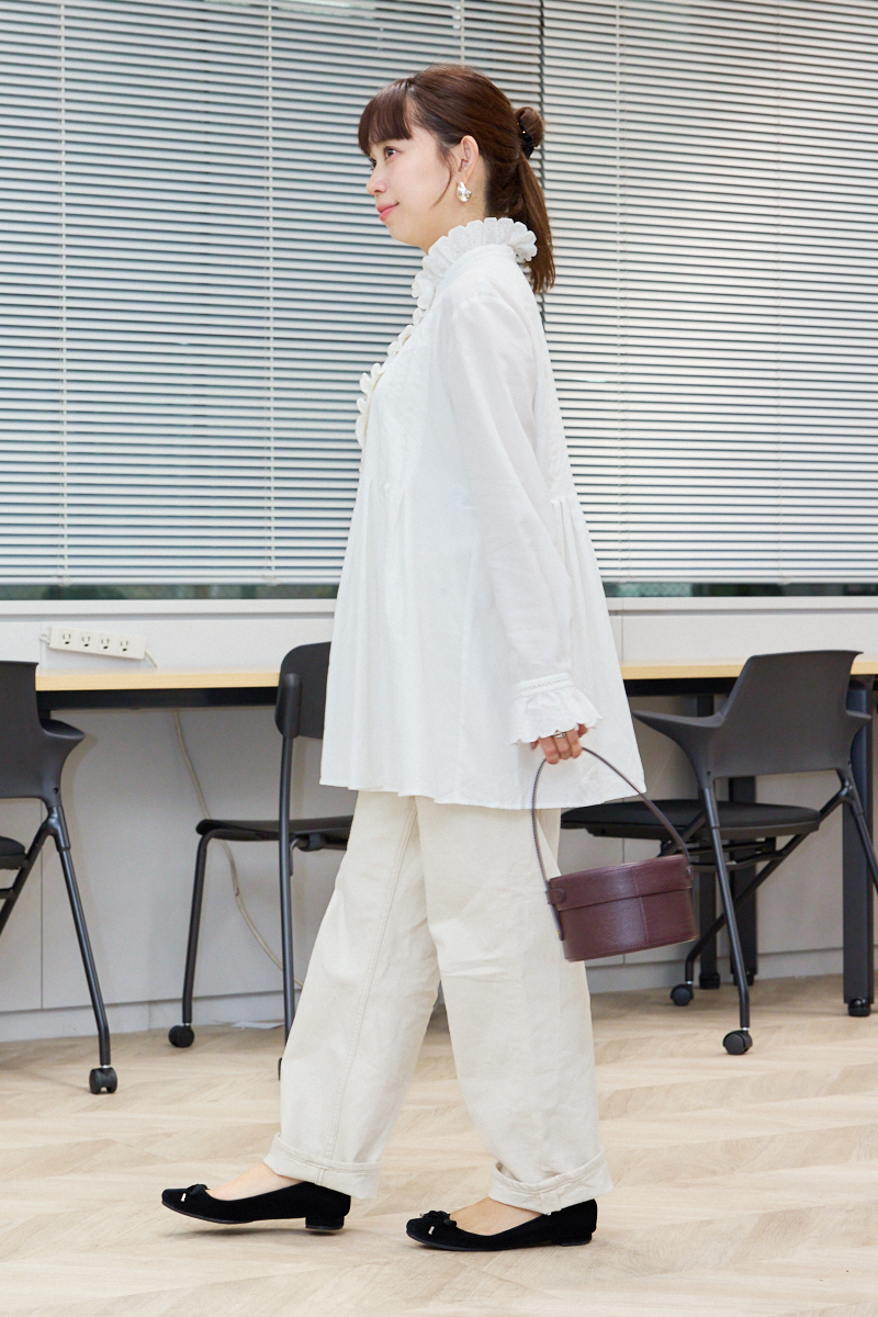 「習い事の発表会など、少しだけきちんと感が欲しいハレの日には、いつものコーデにジャケットをプラス。甘い要素のあるブラウスなので、ボトムスはデニムを合わせて甘さを抑えました。ホワイトデニムならカジュアルになりすぎずキレイめシーンにも◎。室内で暑くなって脱いでも華やかさがあり、シワにならないブラウスはアウター必須のこれからの時期にも大活躍しそうです」編集菅原圭絵・35歳(152cm/5歳の女の子ママ)