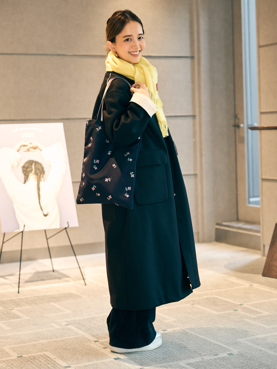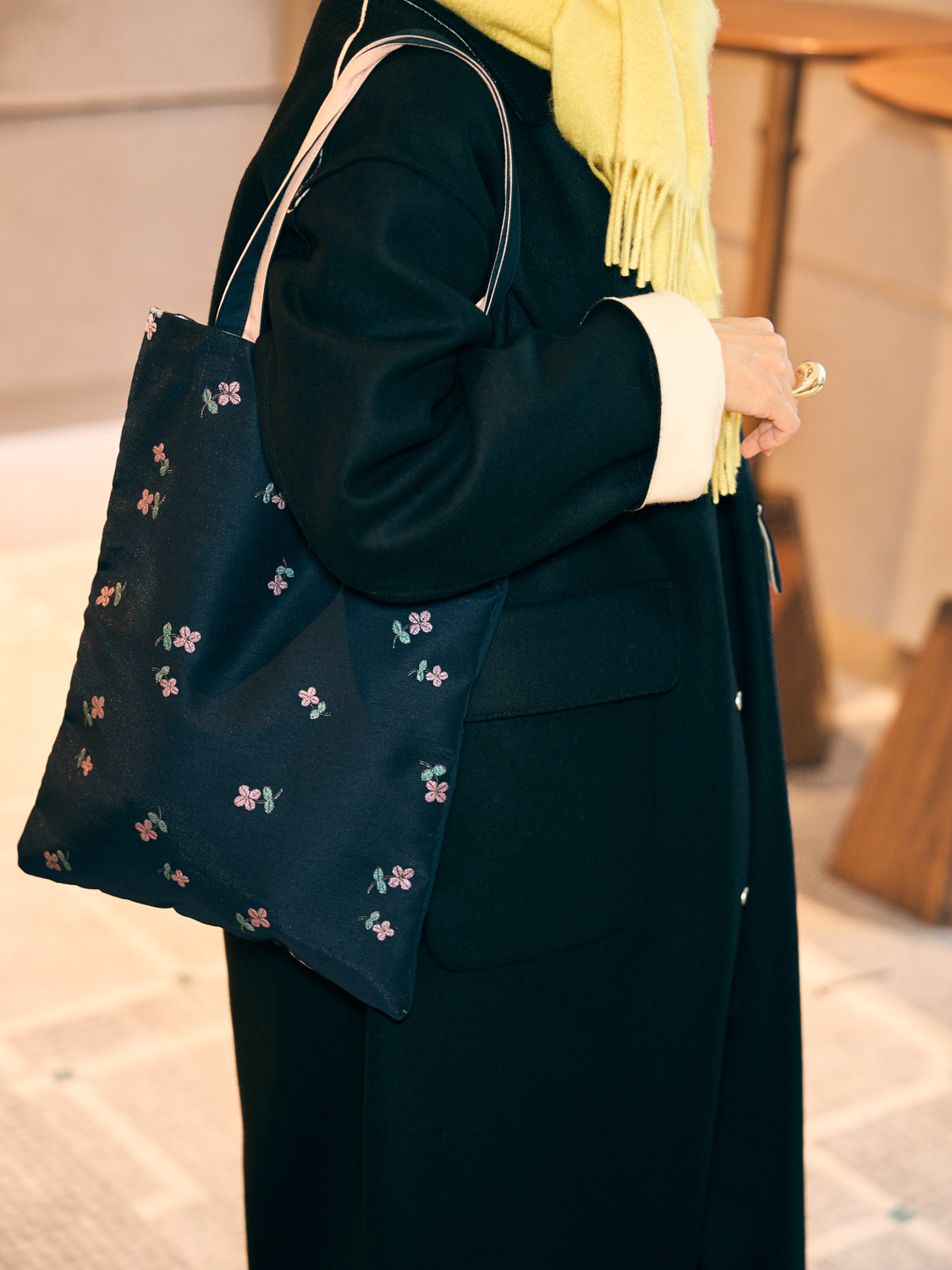 「『主張し過ぎないけど、隠しきれない可愛さも秘めている』そんな思いを込めて作ったバッグです。どんな服装のときも持ちやすく、合わせやすく。華美にならず、学校行事などオケージョンスタイルにも活躍できるようネイビーベースに。VERYやPCはもちろん、保護者会などで配られるA4プリントを折らずに収納できるサイズにしました。薄いので、いつものバッグと一緒に持ち歩き用としても使えます! 肩掛けにも手持ちにもちょうどよく使える長さなのもポイントです」