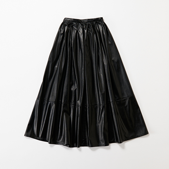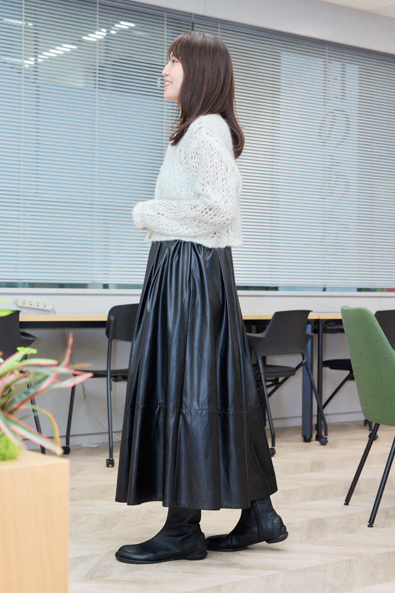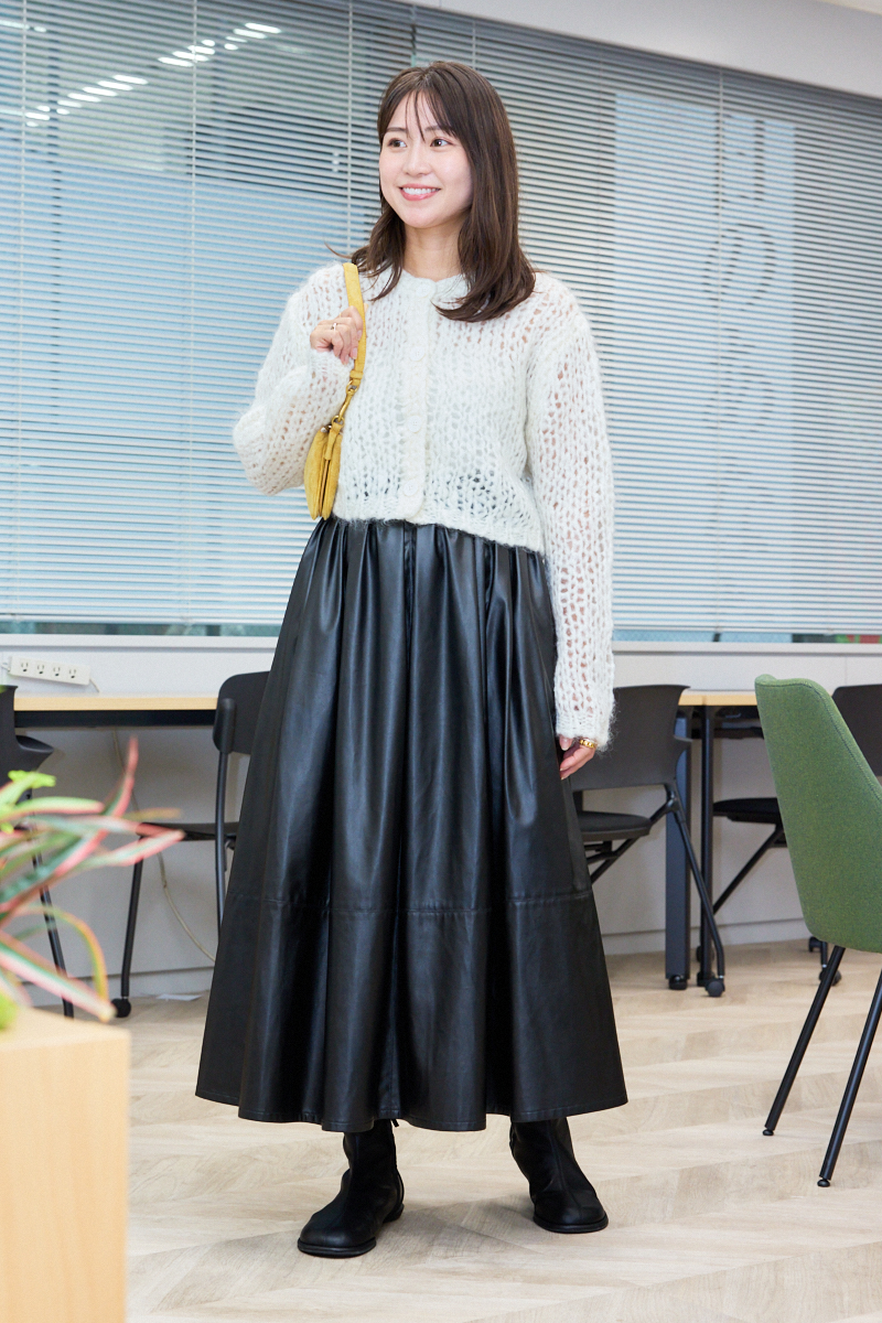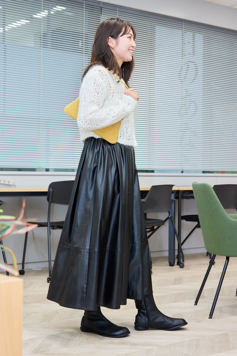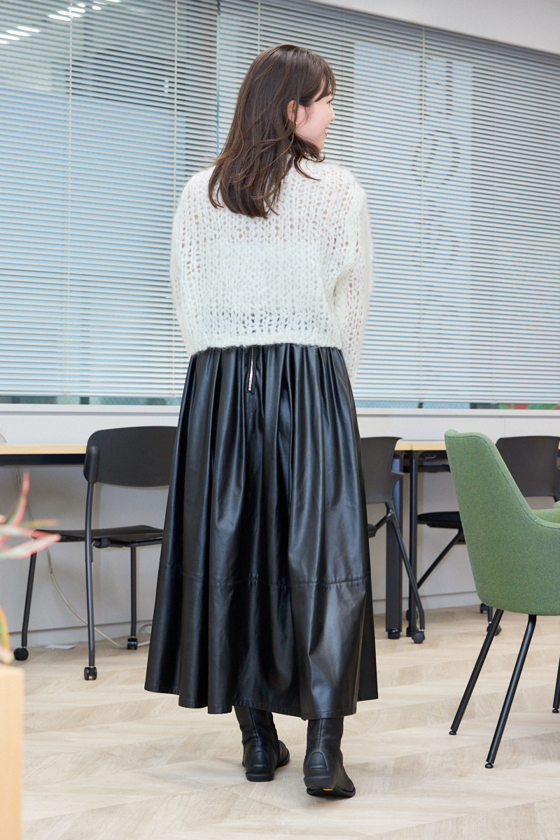 「ママ友とのたまのランチには好印象にうつるようほどよいトレンド感を加えました。モヘアニットで冬っぽさをイメージし、合わせるスカートはちょっぴりレザー調で大人な甘辛コーデに。スカートはウエストの後ろがゴム仕様でランチ中も快適なんです。ギャザーがたっぷり入っているのでボリュームがあり、歩くとひらりと華やかに見えるのがお気に入り」ライター降籏咲子さん・33歳(164cm/3歳の女の子ママ)