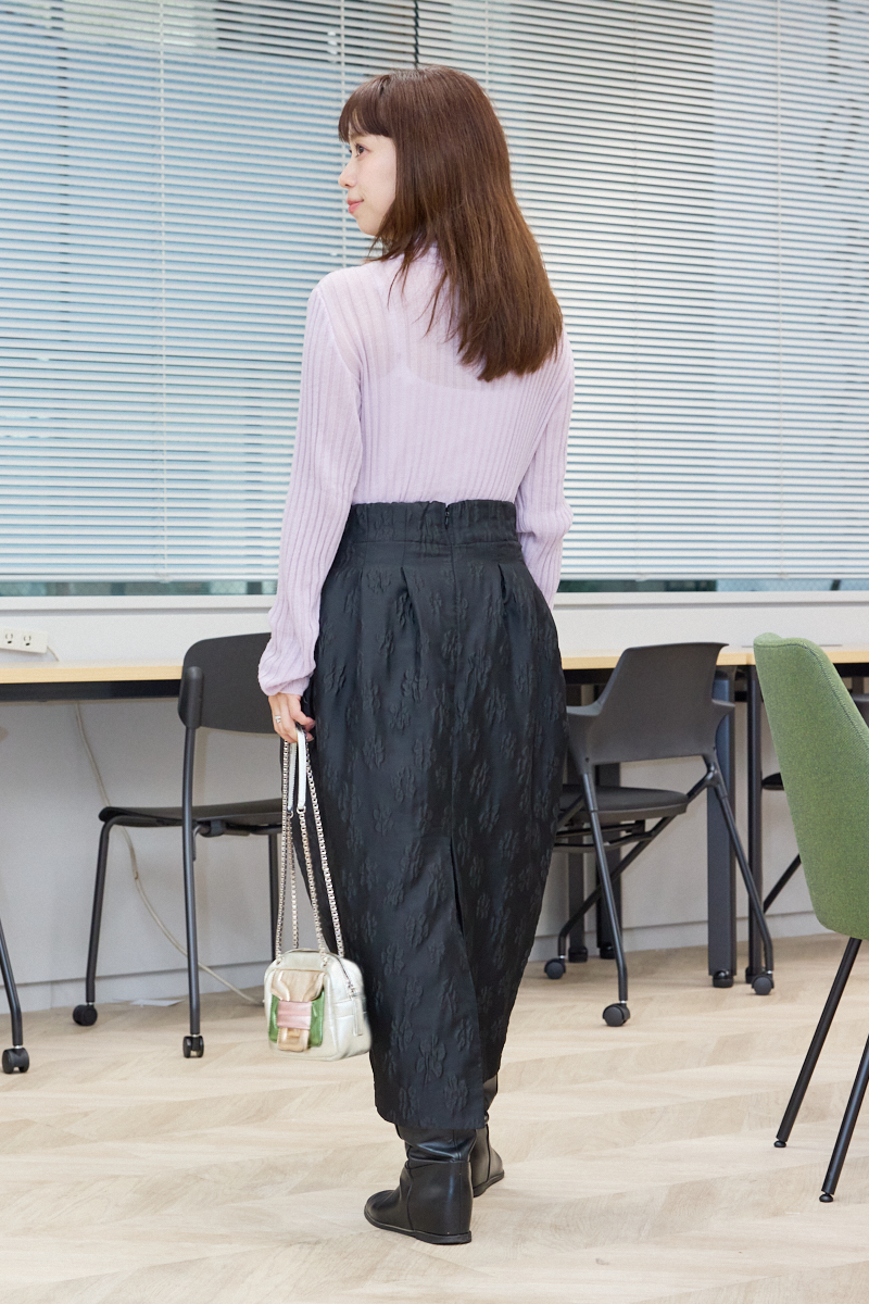 「この時期のママ友ランチはいつもよりちょっと華やかにしても浮かないかも、と冬にぴったりのピンクの色味がきれいなニットに。甘くなりすぎないようにほかのアイテムはブラックでまとめました。優しいピンクニットが顔色を明るく見せてくれ、暖かなウール素材だけどゆったりシルエットだから室内でもストレスフリー。心置きなくランチを楽しめます」編集菅原圭絵・35歳(152cm/5歳の女の子ママ)