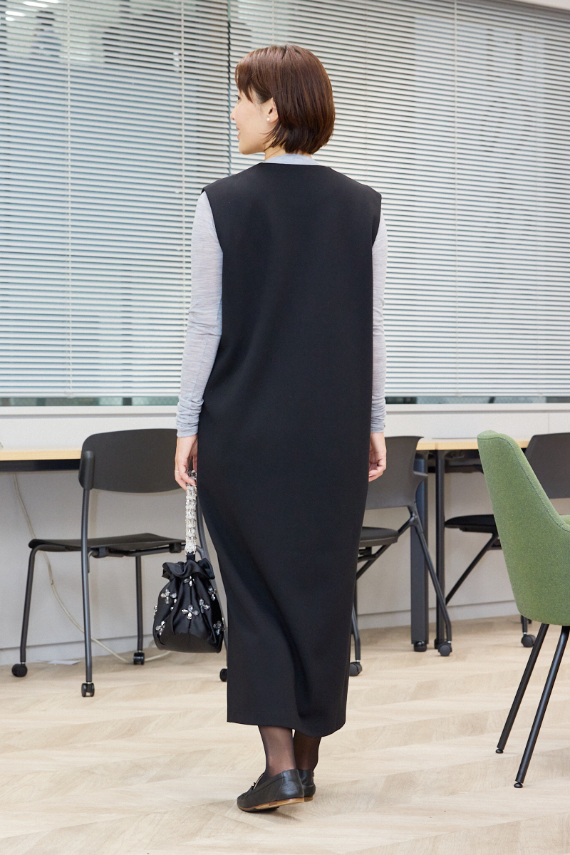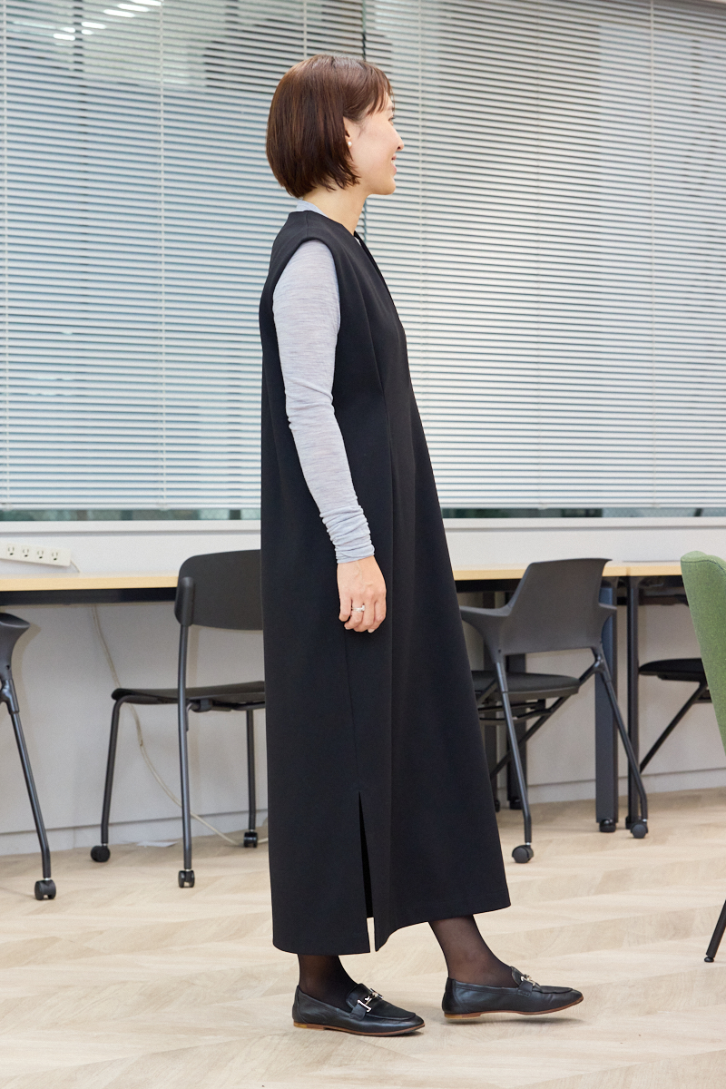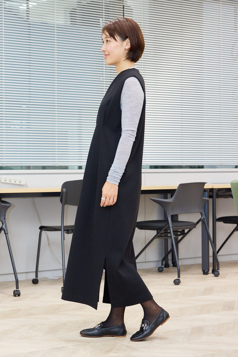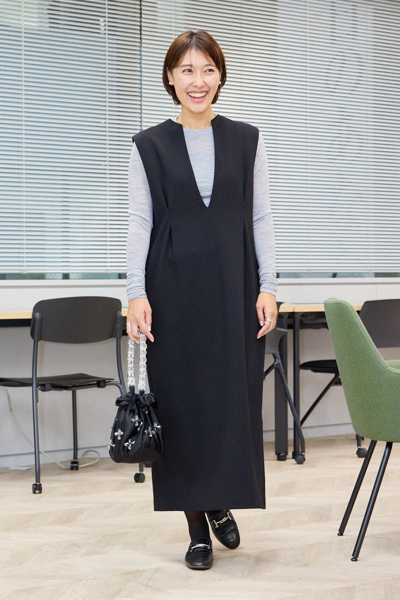 「冬休み前に最後のママ友ランチ。こどもたちの成長ぶりやママのあるあるについて話のつきない、束の間のご褒美時間。たくさん食べてお茶も飲みたいから、お腹ぽっこりを気にしないでいい、すっきり見えるワンピースが大活躍します。深めのVネックと、胸下に入った立体的なタックで細見え効果もあるからちょっときれいめなランチ会場でもバッチリ。グレーのインナーを合わせてかしこまりすぎない雰囲気にまとめました」ライター小川理蓉さん・36歳(158cm/8歳、7歳、3歳の男の子ママ)