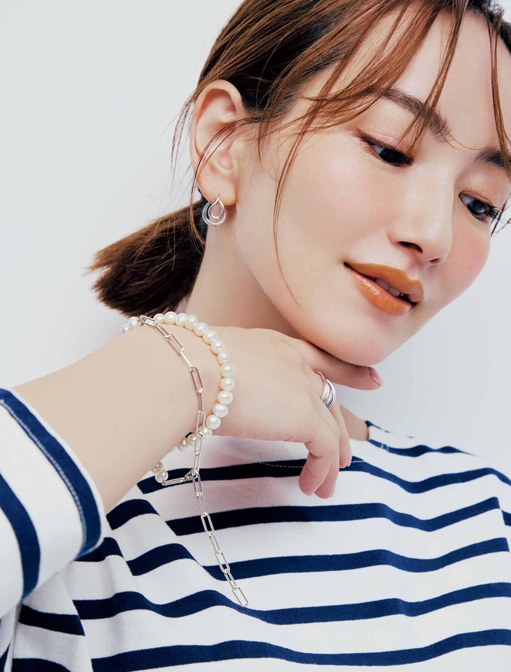 ネックレス〈SV×淡水パール〉※オリジナルサブバッグ付き〈数量限定〉¥33,000ピアス「Noble of Water」〈SV/Ptコーティング〉¥26,400リング「Noble of Water」〈SV/Ptコーティング〉¥24,200 ※ピアスとリングは2026年1/16発売(すべて4℃/エフ・ディ・シィ・プロダクツ)ボーダーカットソー¥25,300(SEA/エスストア)