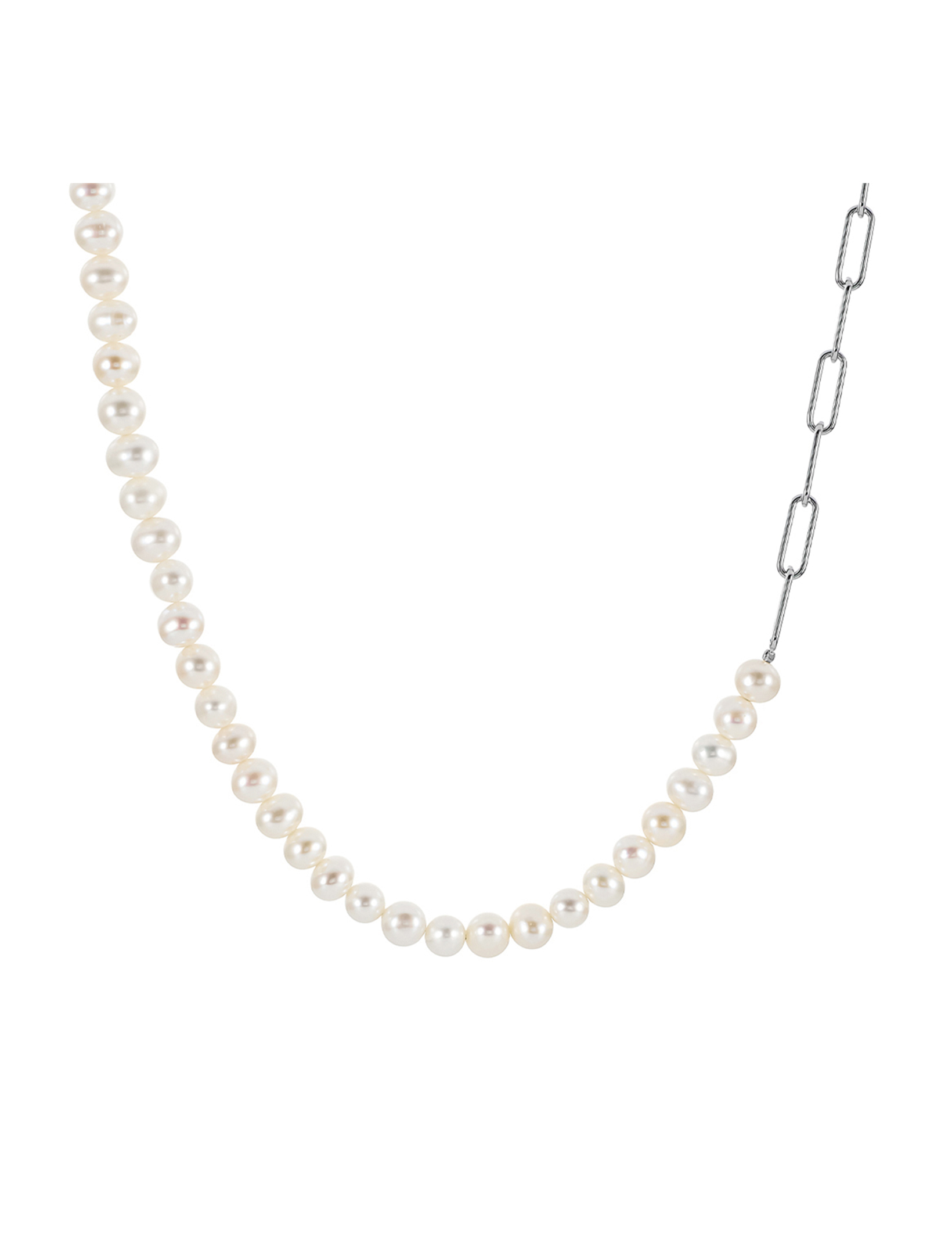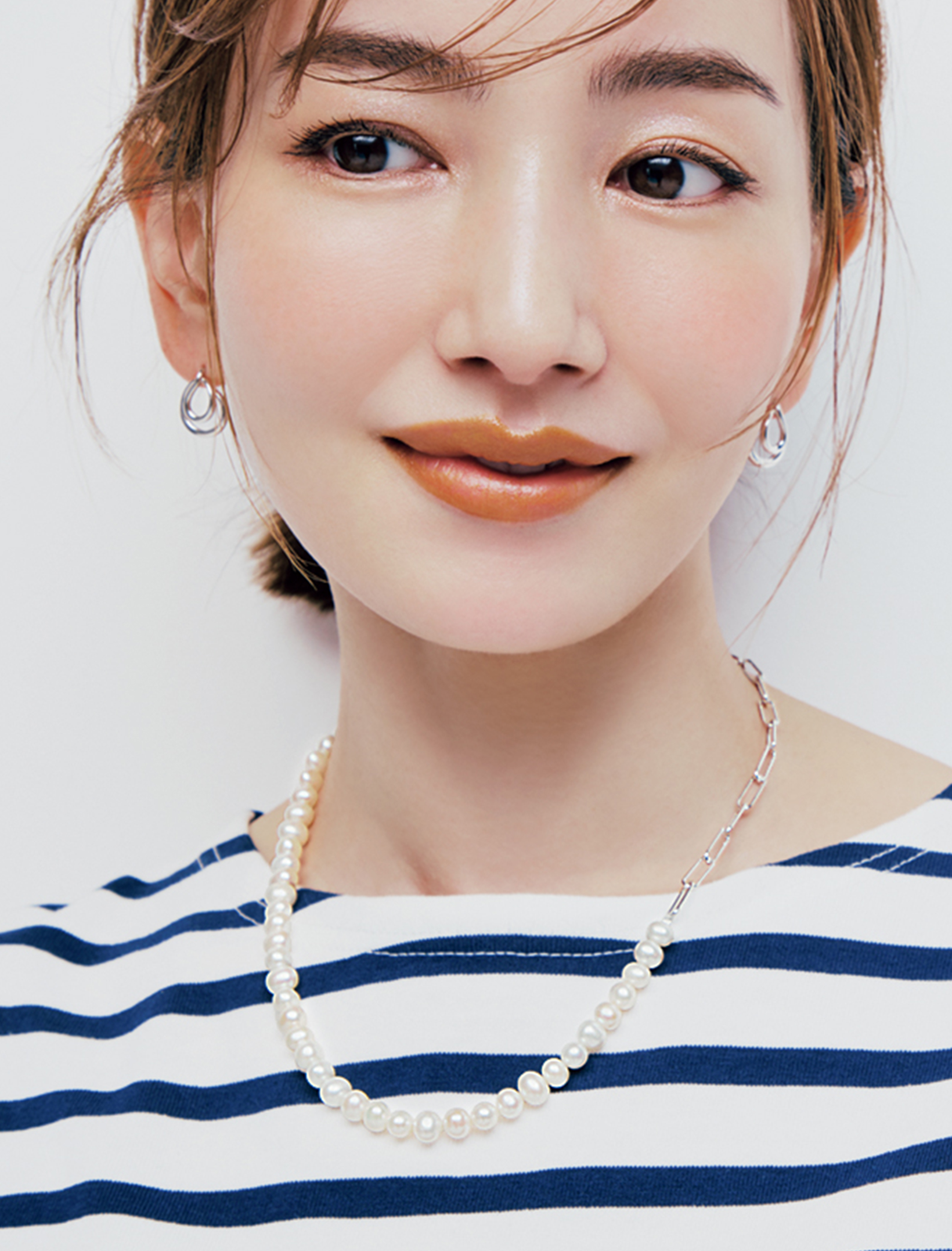 オケージョン↔デイリーにシームレスに使える汎用性の高さと、アレンジ次第でさまざまな楽しみ方が広がるパールネックレスに仕上がりました。チェーン部分があることで生まれる軽やかな魅力を、ぜひ体感してーMAMI