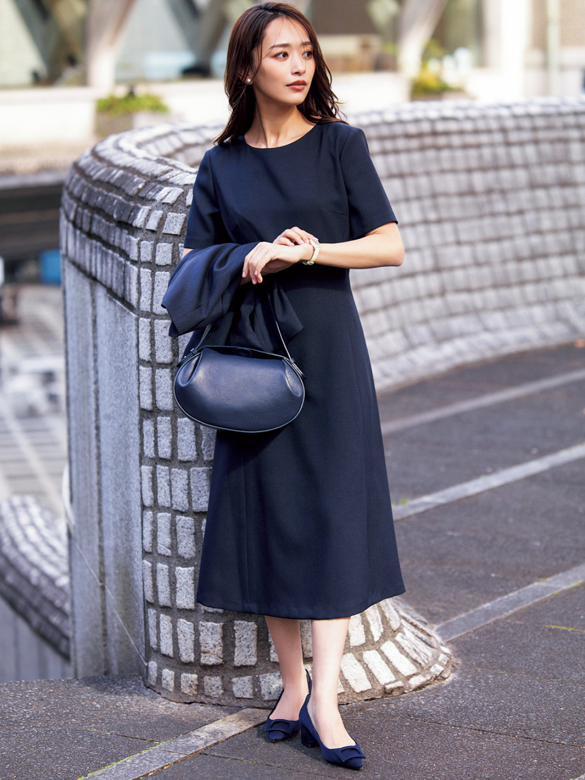 シンプルベースだからこそ羽織り次第で印象もがらり、着回し力の高さも魅力の半袖ワンピ。面談やお教室はもちろん、お出かけやママ友ランチにも重宝。オールシーズン対応の心地いい生地で、年中気軽に使えます。オーダーワンピース¥33,000〜(KASHIYAMA) カーディガン¥35,200(スローン╱ザ ショップ スローン 新静岡セノバ店) ネックレス¥15,400〈エムシー・スタジオ〉 ピアス¥9,130〈ケネス・ジェイ・レーン〉 リング¥10,780〈ピニャッタ〉(すべてZUTTOHOLIC) パンプス¥17,600(ダイアナ╱ダイアナ 銀座本店) レッスンバッグ¥8,250(Coco chic)