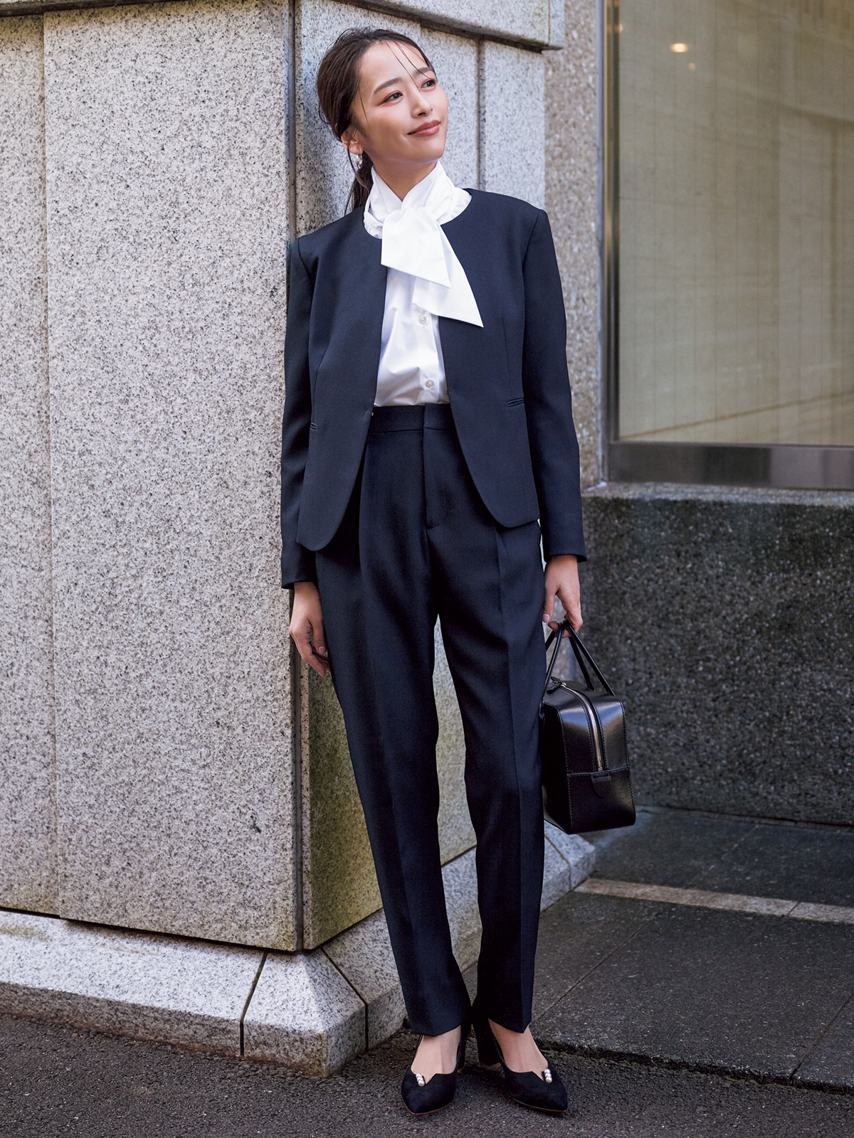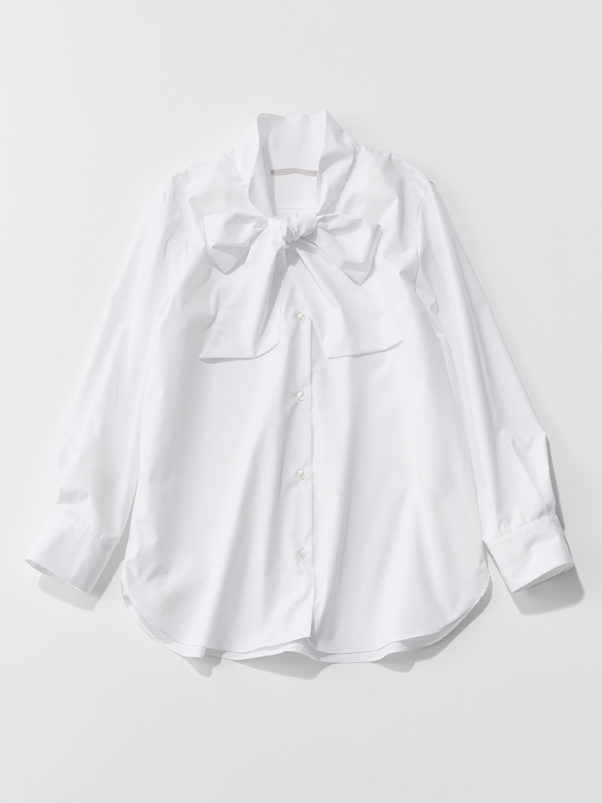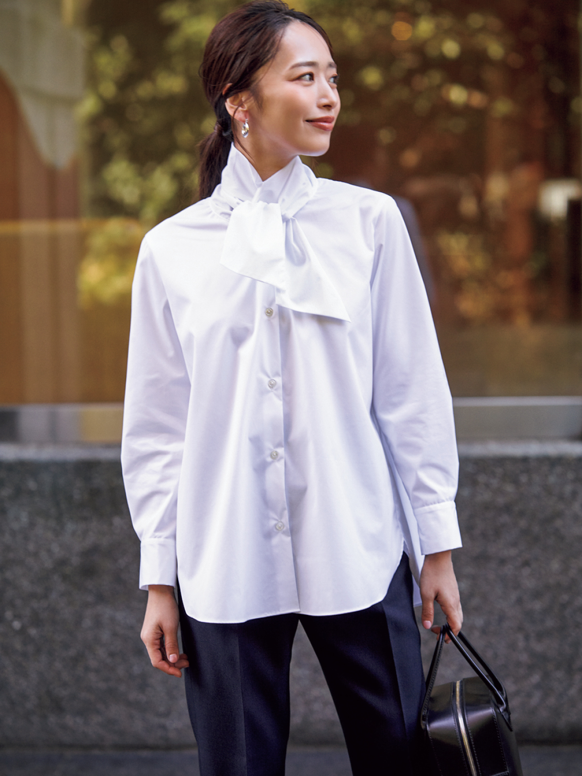 着映え力抜群のリボンタイブラウスは、着丈を5cm足して、後ろ姿はもちろん、サイドからも美しいシルエットに。裄丈はジャケットから出ないように調整。1枚で着てもジャケットのインナーとして着ても使いやすいマイサイズにこだわりました。