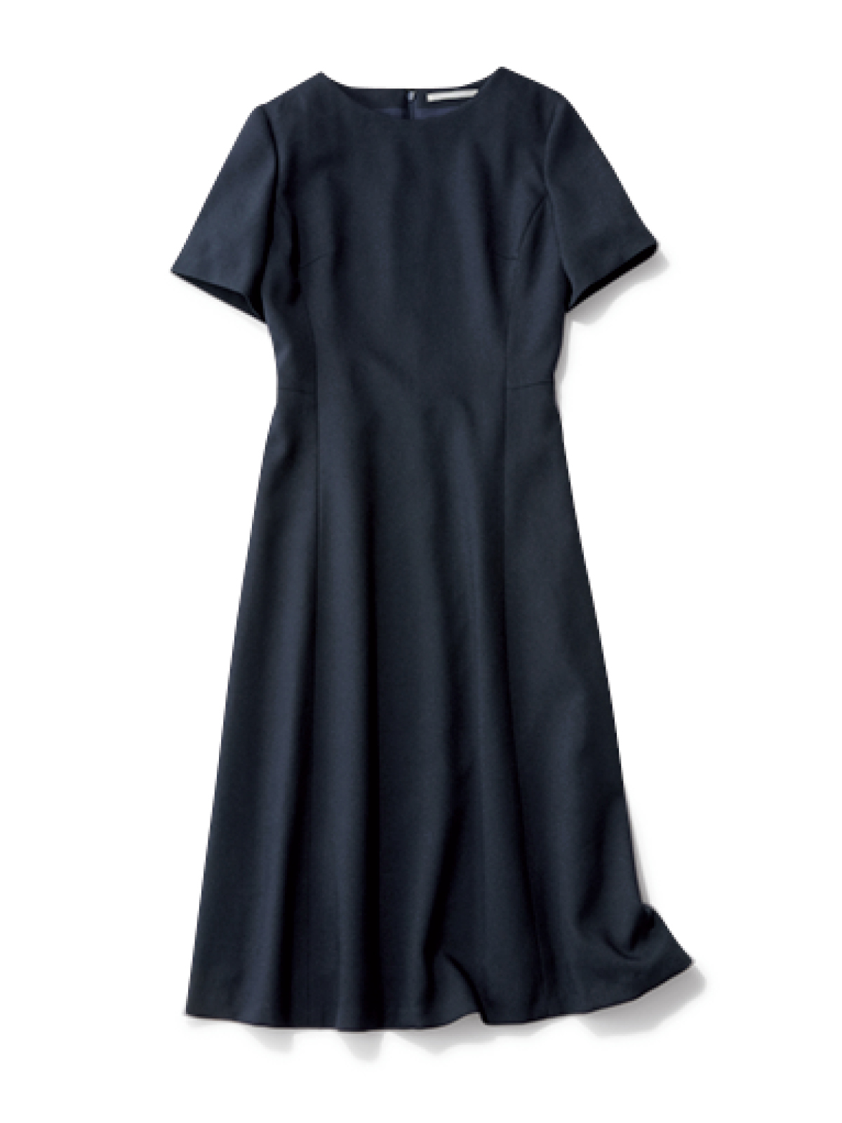 脚がきれいに見えて、オシャレ心を託せる長さにこだわって最大限伸ばした着丈。座った時に膝が見えず、でも重くはならないバランスに。さりげなく二の腕カバーを狙って袖丈もプラス! パンプス¥18,150(ダイアナ╱ダイアナ 銀座本店)