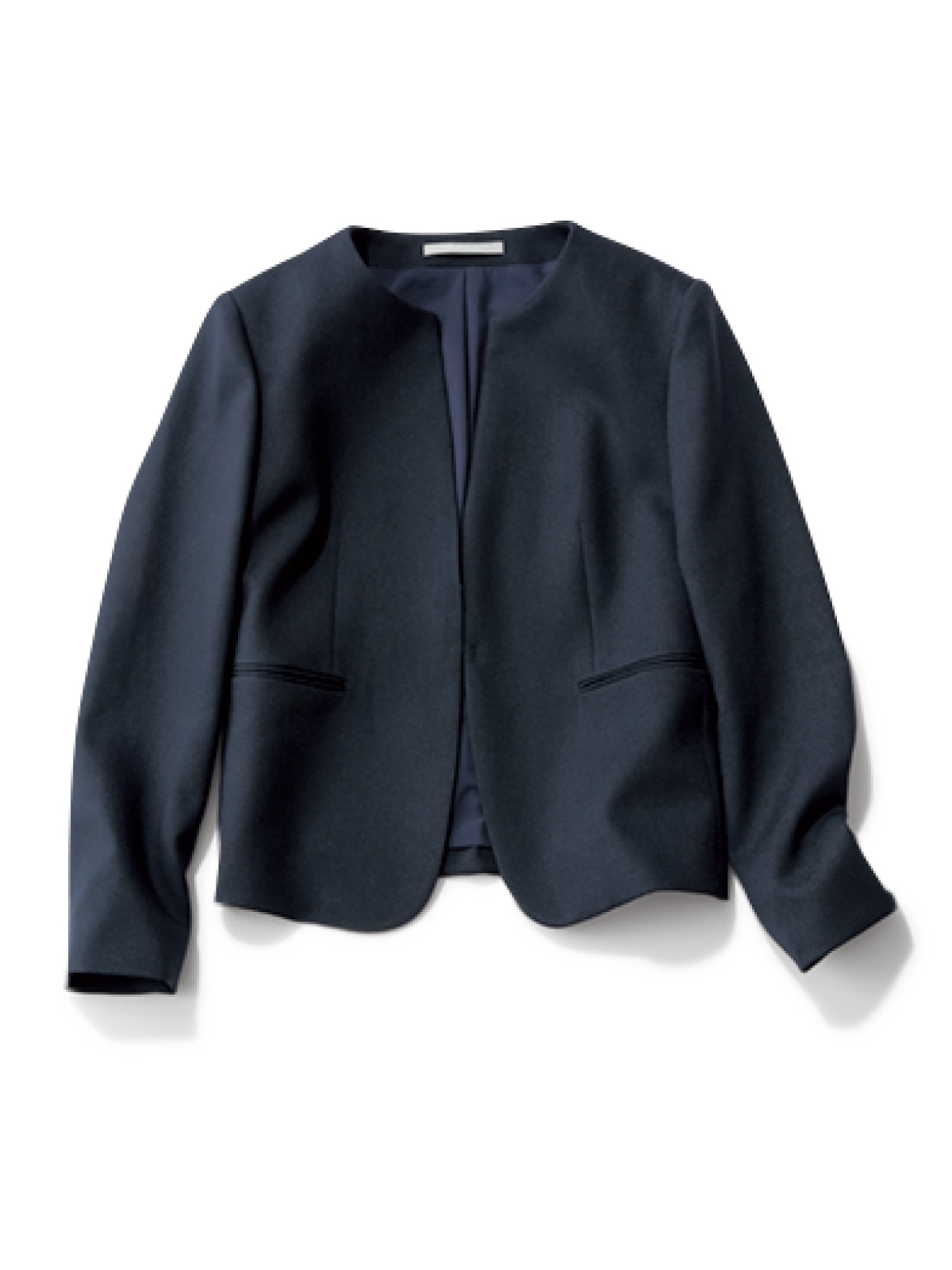 端正なノーカラージャケットは着丈を3cm詰めてすっきりコンパクトに。ワンピースに重ねた時にAラインが美しく広がってドラマチック。品良くスタイルアップが叶います。オーダージャケット¥38,500〜 オーダーワンピース¥33,000〜(ともにKASHIYAMA) イヤリング¥8,800 時計¥15,120(ともにアビステ) パンプス¥27,500(ツル バイ マリコ オイカワ) バッグ¥49,500(リンレザー) ブローチ・スタイリスト私物