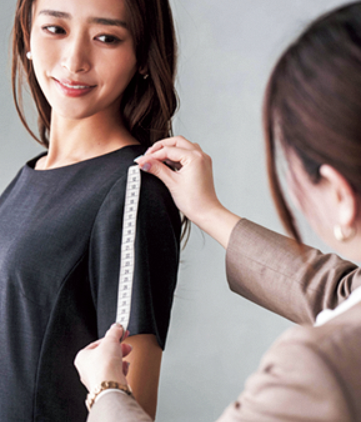 初回は熟練フィッターがボディサイズを採寸。着丈、袖の長さ、ウエストなど、こだわりたい部分をオーダー、ジャストな一着を提案してくれます。(1着目のデータをもとに、2回目の購入はオンラインからも可能!)
