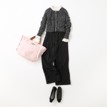 ピンクやラベンダーや水色やミントカラーといった好感度抜群のキレイ色カーデは、羽織るだけで家のなかを明るく新年ムードに。インナーに白Tを挟むと着こなしに奥行きとカジュアルさがプラスされて、より親しみやすく仕上がります。カーディガンはローブ ブラン、パンツはアルページュストーリー、バッグはロー ソウルのもの。