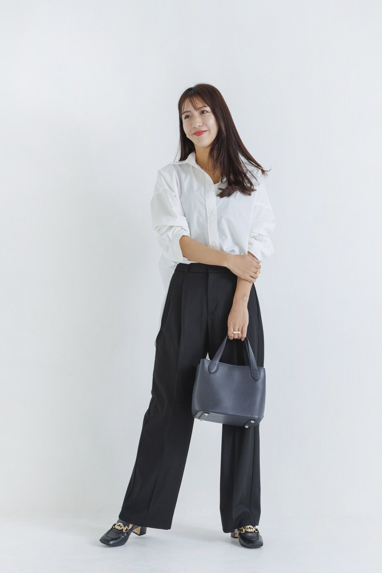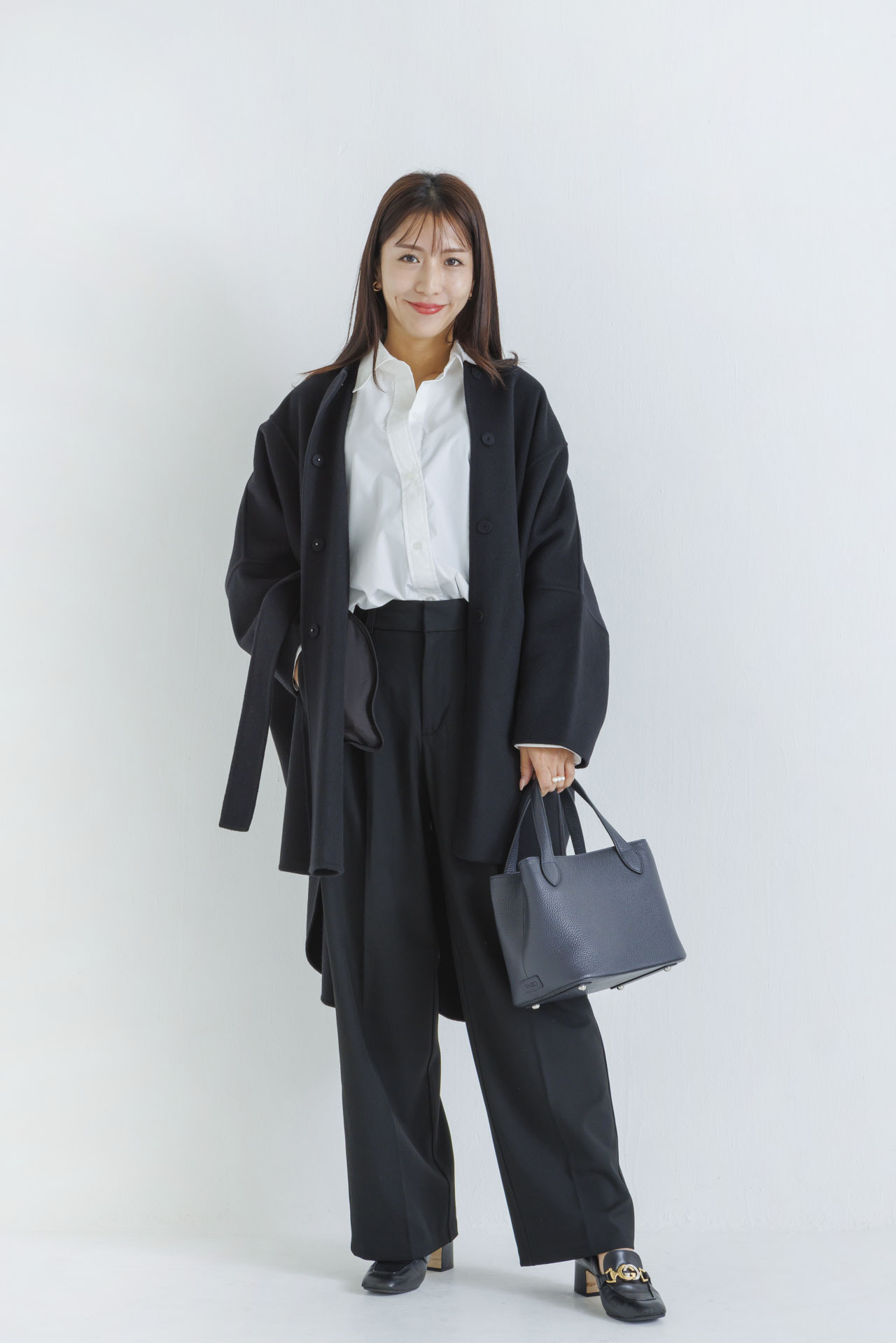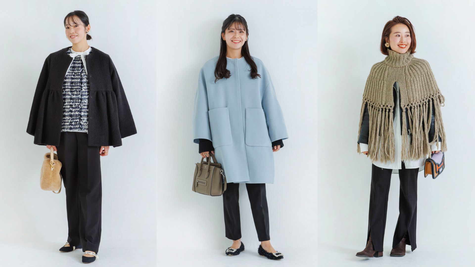 白シャツ+黒パンツをベースに、関西ママたちの冬の一軍アウターをご紹介。アウターを脱いでもオシャレをキープできる、レイヤード術も教えてもらいました。