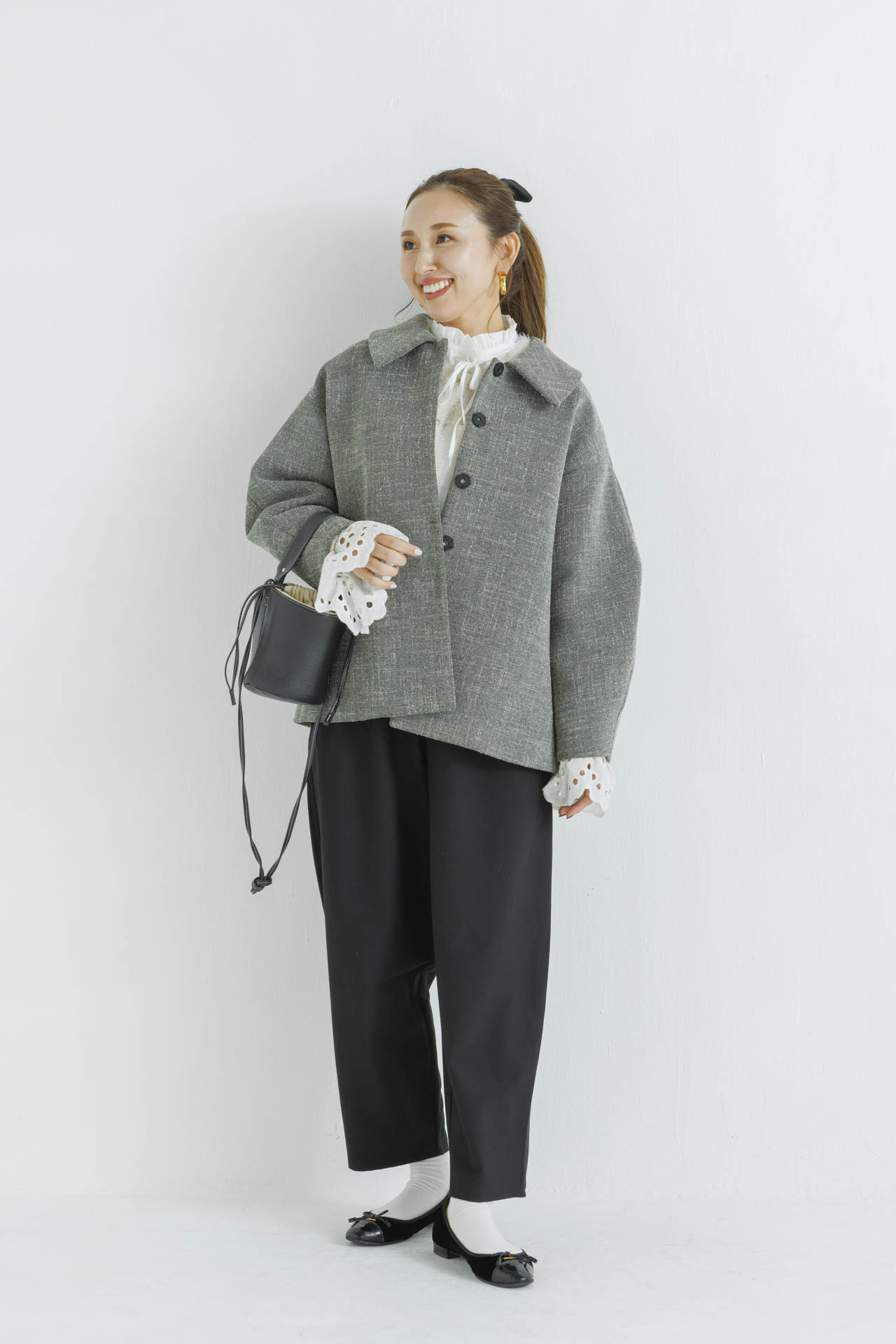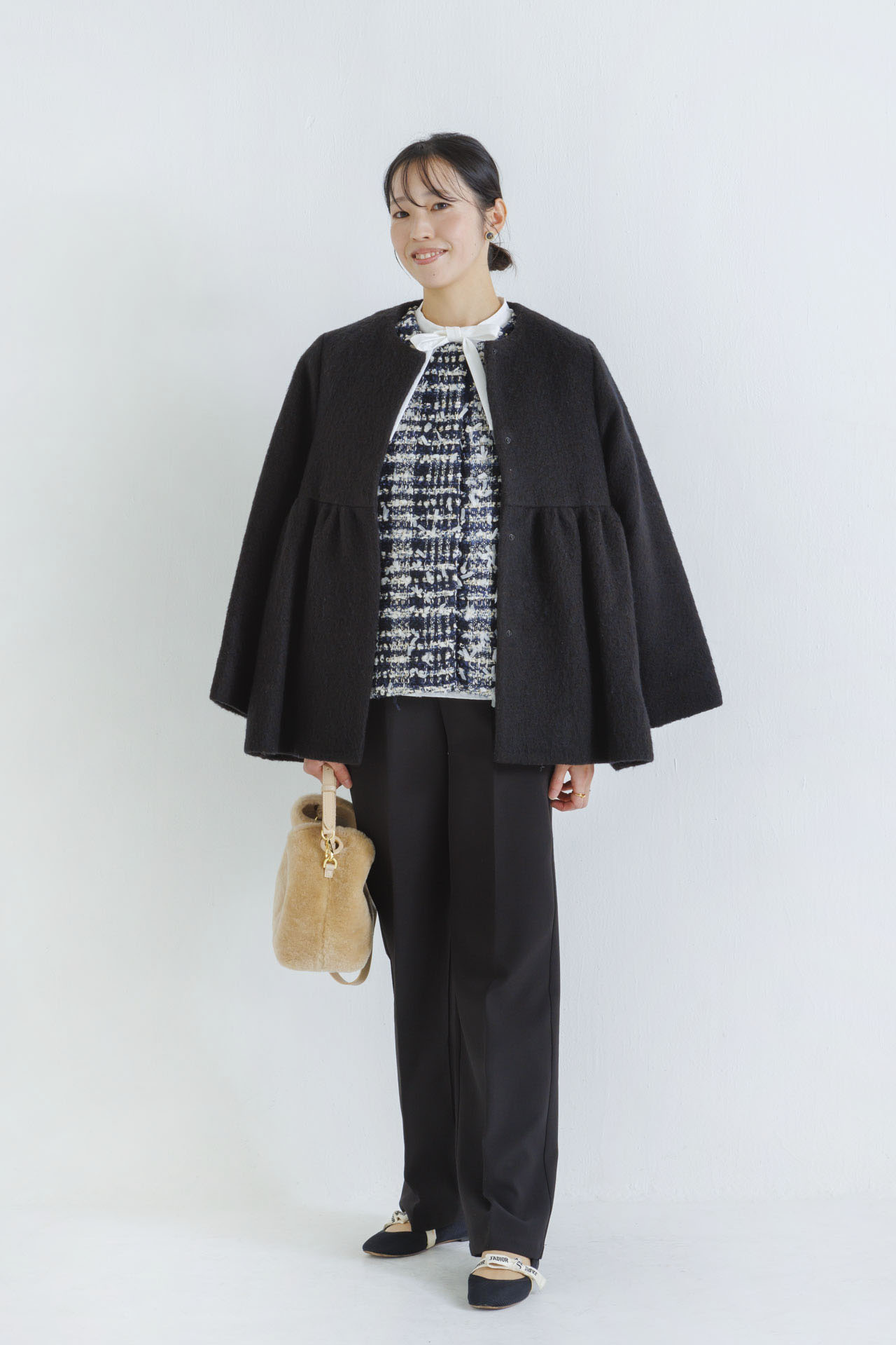 ツイードジレ×フレアショートコートでモノトーンも重く見えません