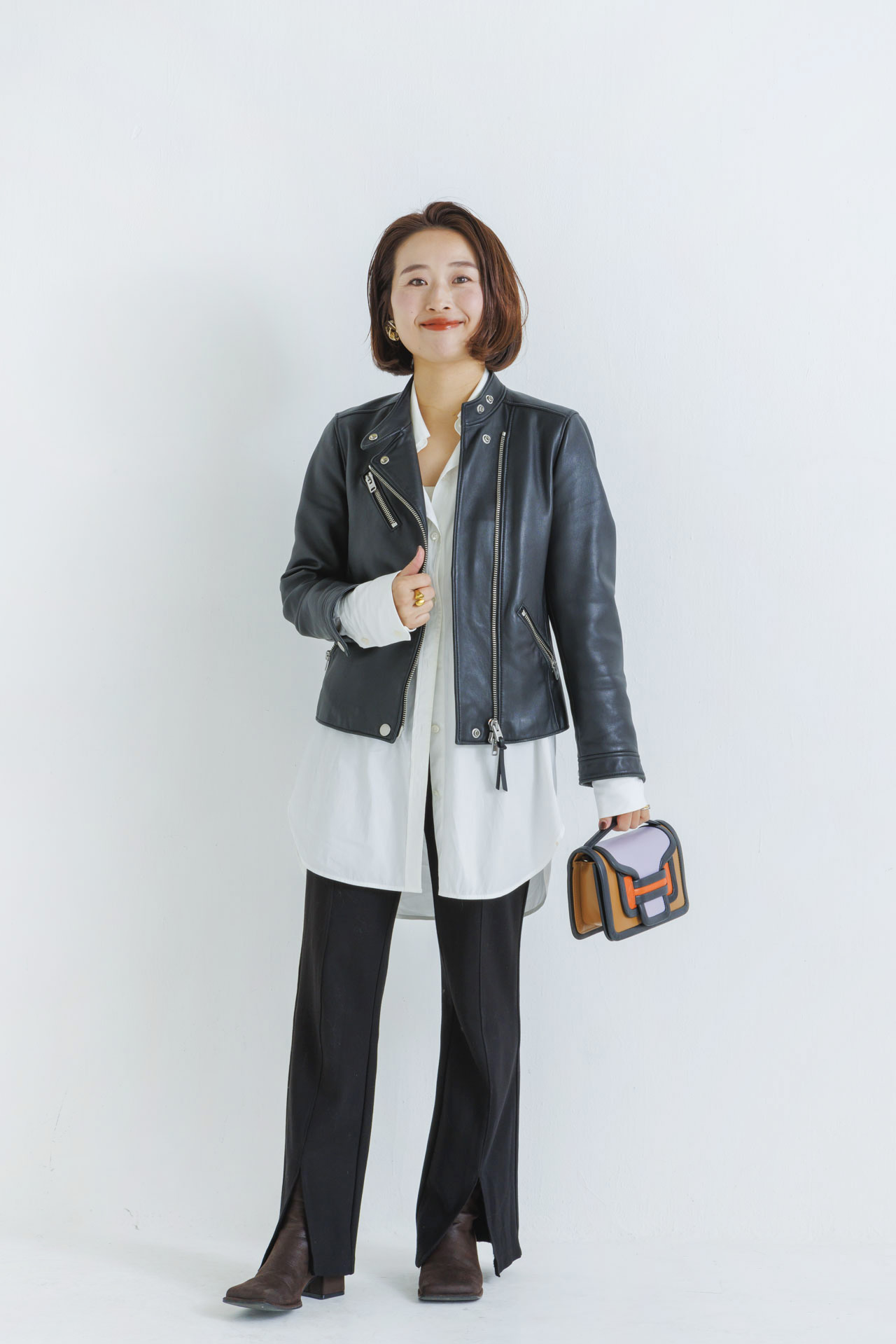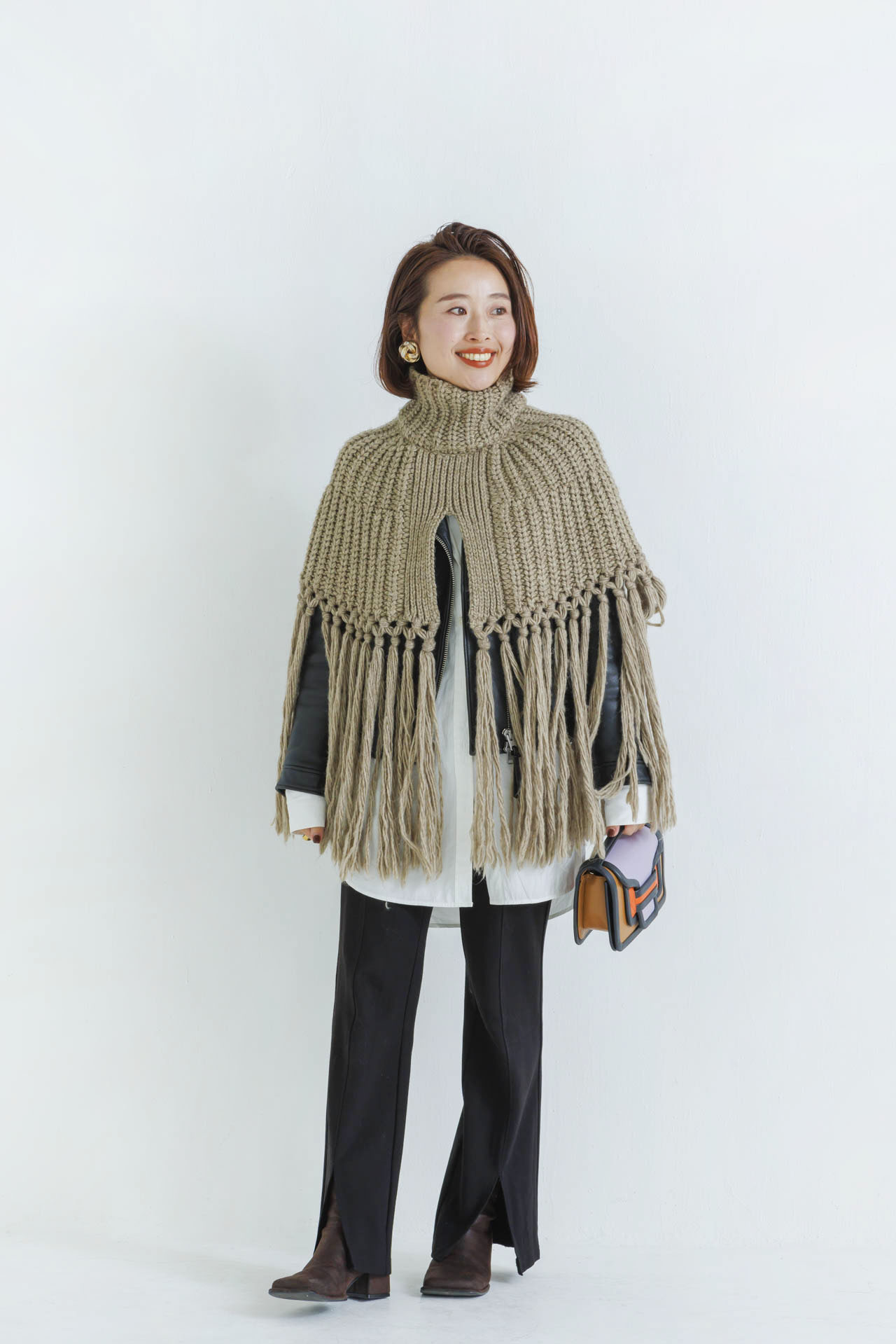 「シンプルなものこそ素材感がよく、長く使えるアイテムを選ぶようにしています。レザーのライダースはコーチのもので、流行りがなく飽きずに10年後も愛用していることを確信して購入。ライダースの上にフリンジポンチョをレイヤードすることで、遊び心を演出しました」木村美和さん/40歳(155㎝・3歳の男の子ママ)