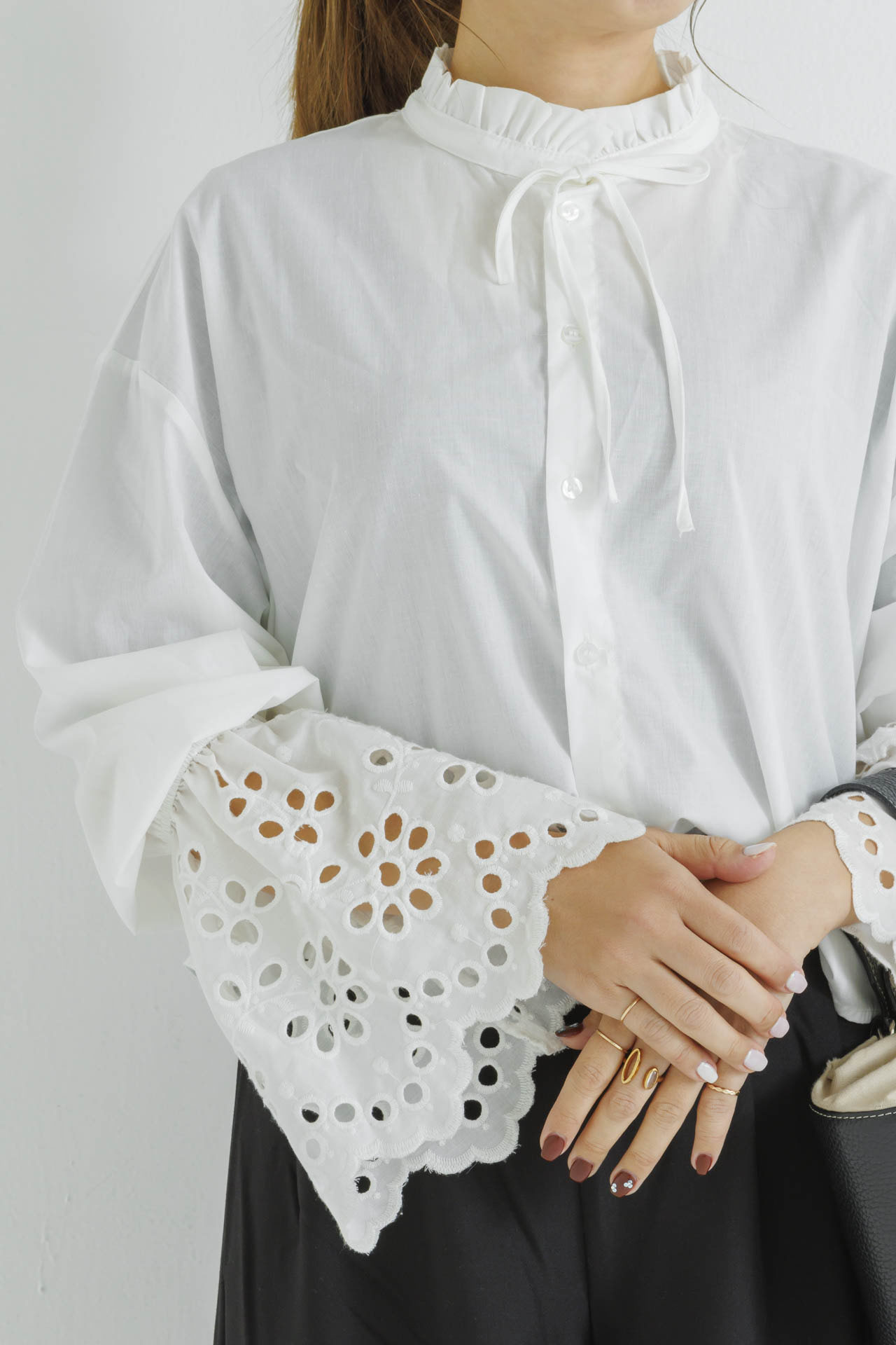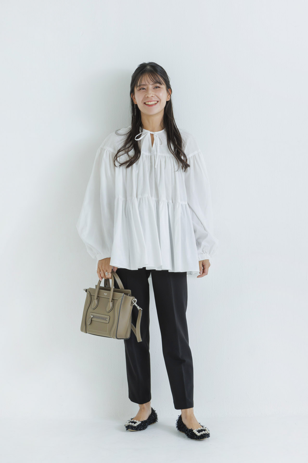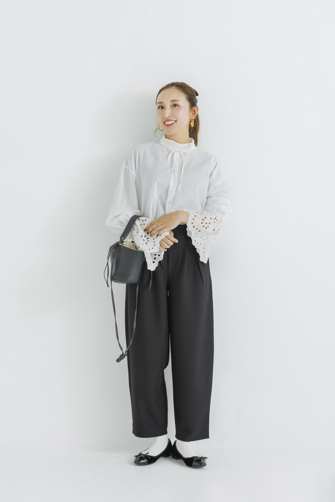袖と襟にデザインがある白ブラウスは、アクセは引き算するのが好バランス