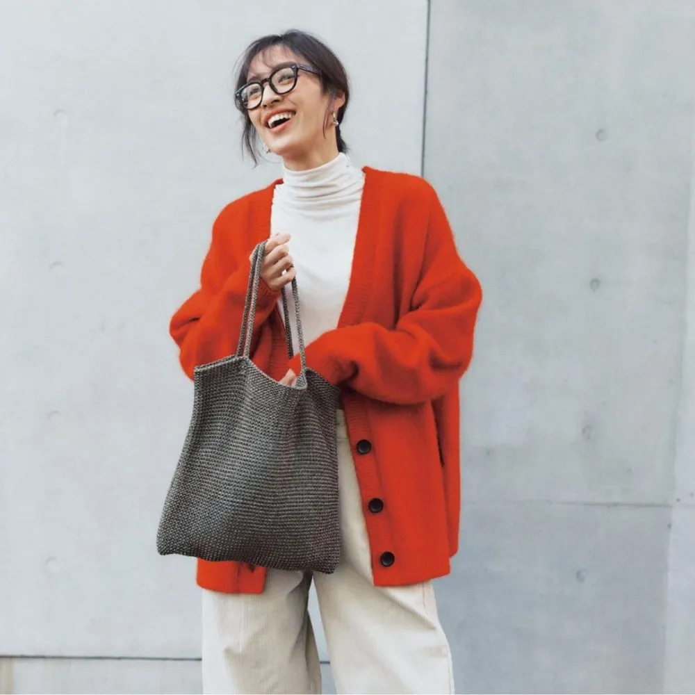 上下白コーデにふわふわの赤いカーディガンを羽織って、冬らしい華やかスタイルに。白と合わせることで赤が優しげにまとまります。サンタの仮装もばっちり似合いそう。ざっくりカーディガンはサラッと羽織れて赤初心者も実は着やすい。カーディガンはノーク、バッグはカシュカシュ。