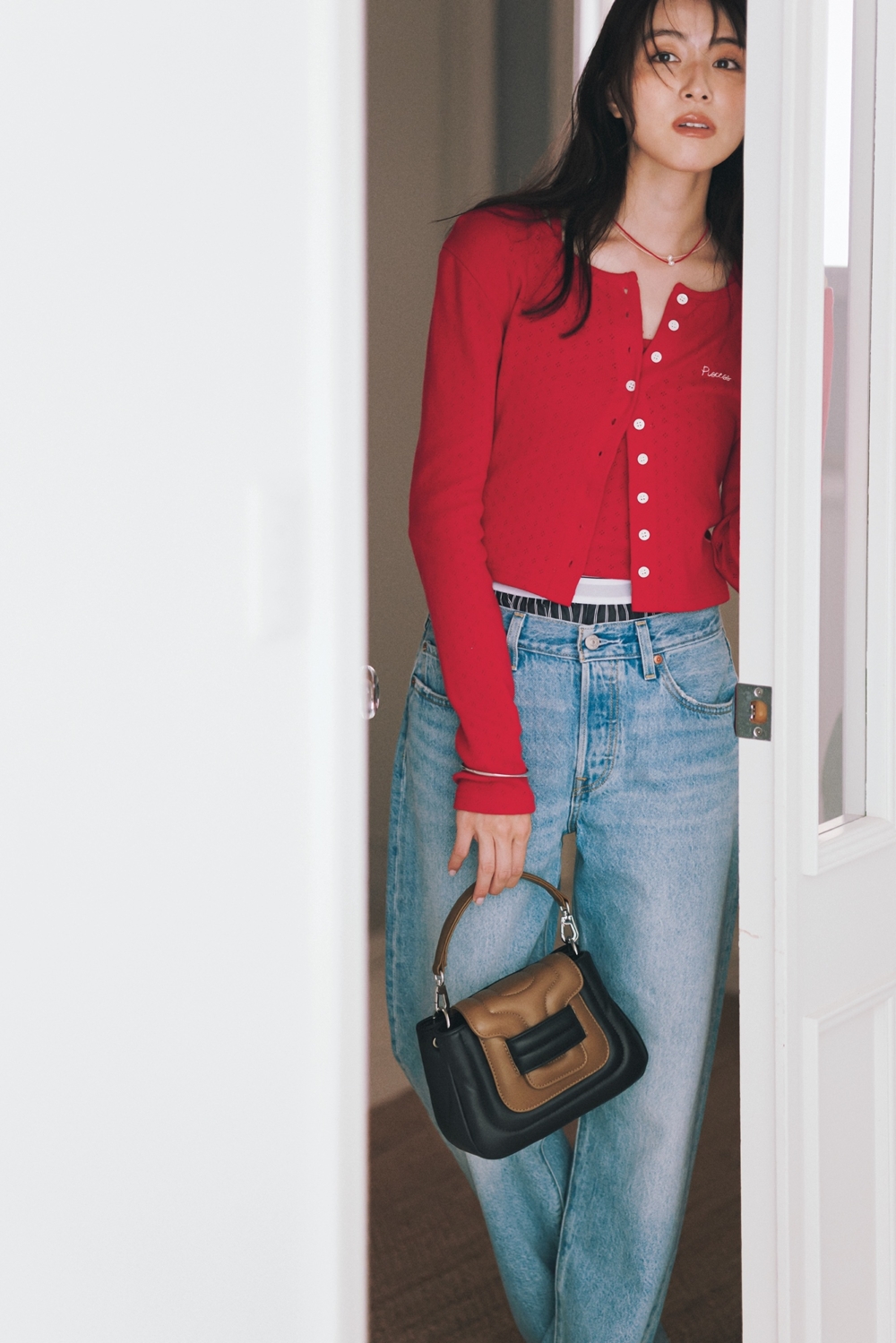 鉄板の赤ニット×デニムの組み合わせ。カーディガンタイプのニットなら、より上品に着こなせます。ボタンを開けて肌を見せて色っぽさを出しても素敵。カーディガンとキャミソールはパイシス、デニムはリーバイス、バッグはピエール アルディのもの。