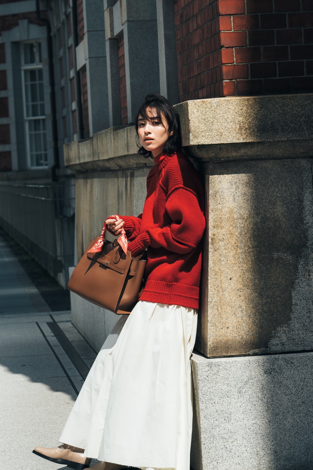 お出かけしたくなるロマンチックなコーディネート。赤ニットにスカートを合わせるなら、コットンやシャカシャカといったカジュアル素材のものを選ぶと適度に抜けが出て大人っぽく仕上がります。なかに着たハイネックニットとプルオーバーニットはシンゾーン、スカートはエトレトウキョウ、バッグはヴァレクストラ、ブーツはペリーコのもの。