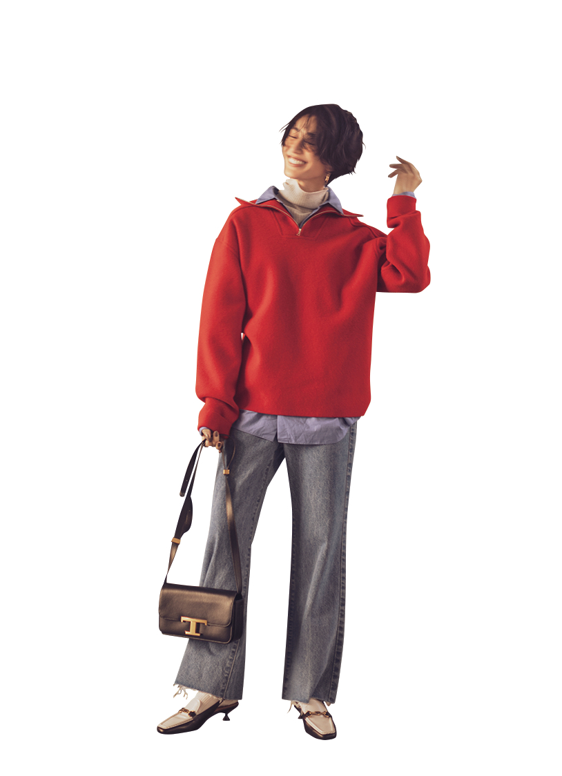 爽やかなブルーシャツは赤ニットと好相性なうえ、デニム合わせでも衿の効果できちんと感がキープできます。寒い日の重ね着にもおすすめなチョイス。ニットはオーラリー、シャツはエイトン、中に着たタートルニットはランバン オン ブルー、デニムはニードバイ ヘリテージ、バッグと靴はトッズのもの。