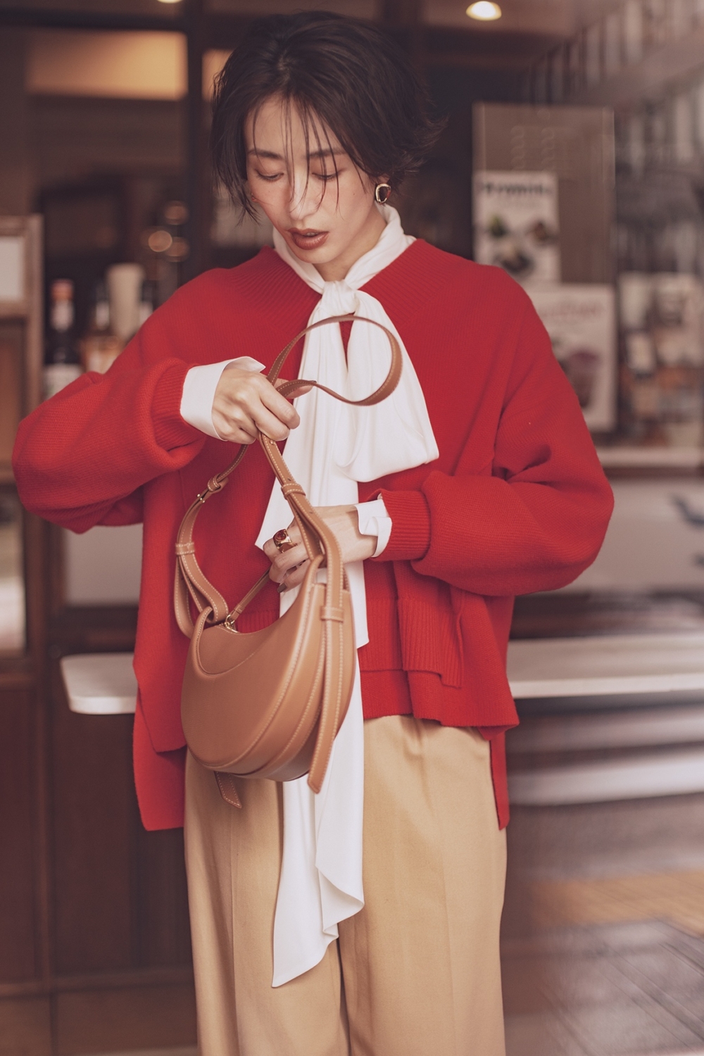 同じベージュパンツ合わせでも、インナーにボウタイブラウスをインするとよりエレガントに! 赤と白のサンタ配色でムードたっぷり。甘ブラウスが苦手な人は小さめの白衿がチラッと覗く程度でもOK。レストランやホテルの会食にもぴったりなクリスマススタイルです。ニットはランバン オン ブルー、ブラウスはデ・プレ、パンツはタンジェント、バッグはポレーヌのもの。
