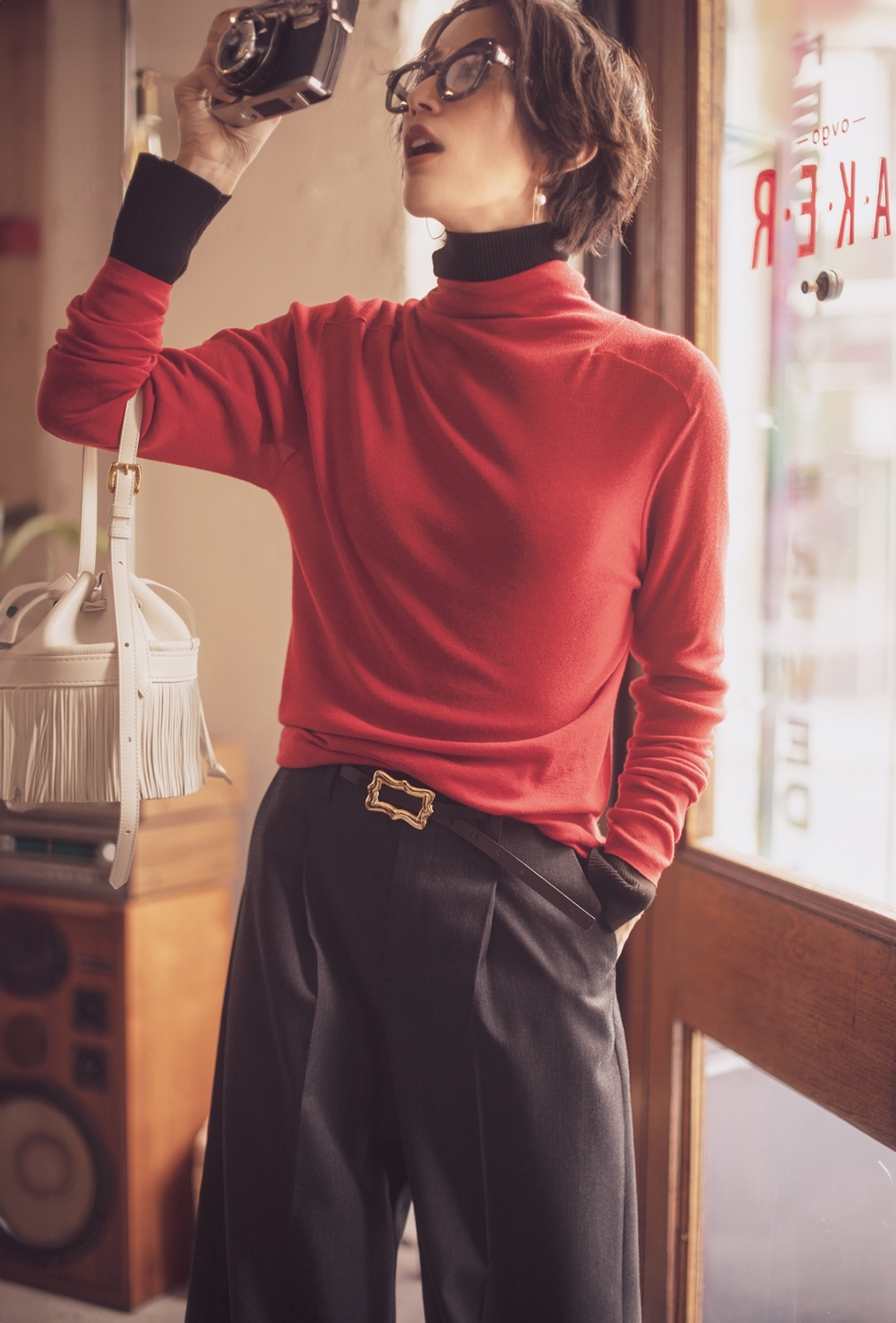 もちろん一枚でも着られる赤のタートルですが、インナーに黒タートルを入れて首元や手首から少し見せるだけでオシャレ度がぐんとアップ。赤タートルが辛口に仕上がるから、会社の集まりにもおすすめ。赤いタートルニットはエイトン、黒いタートルニットはカデュネ、パンツはランバン オン ブルー、ベルトはア ヴァケーション、バッグはJ&M デヴィッドソンのもの。