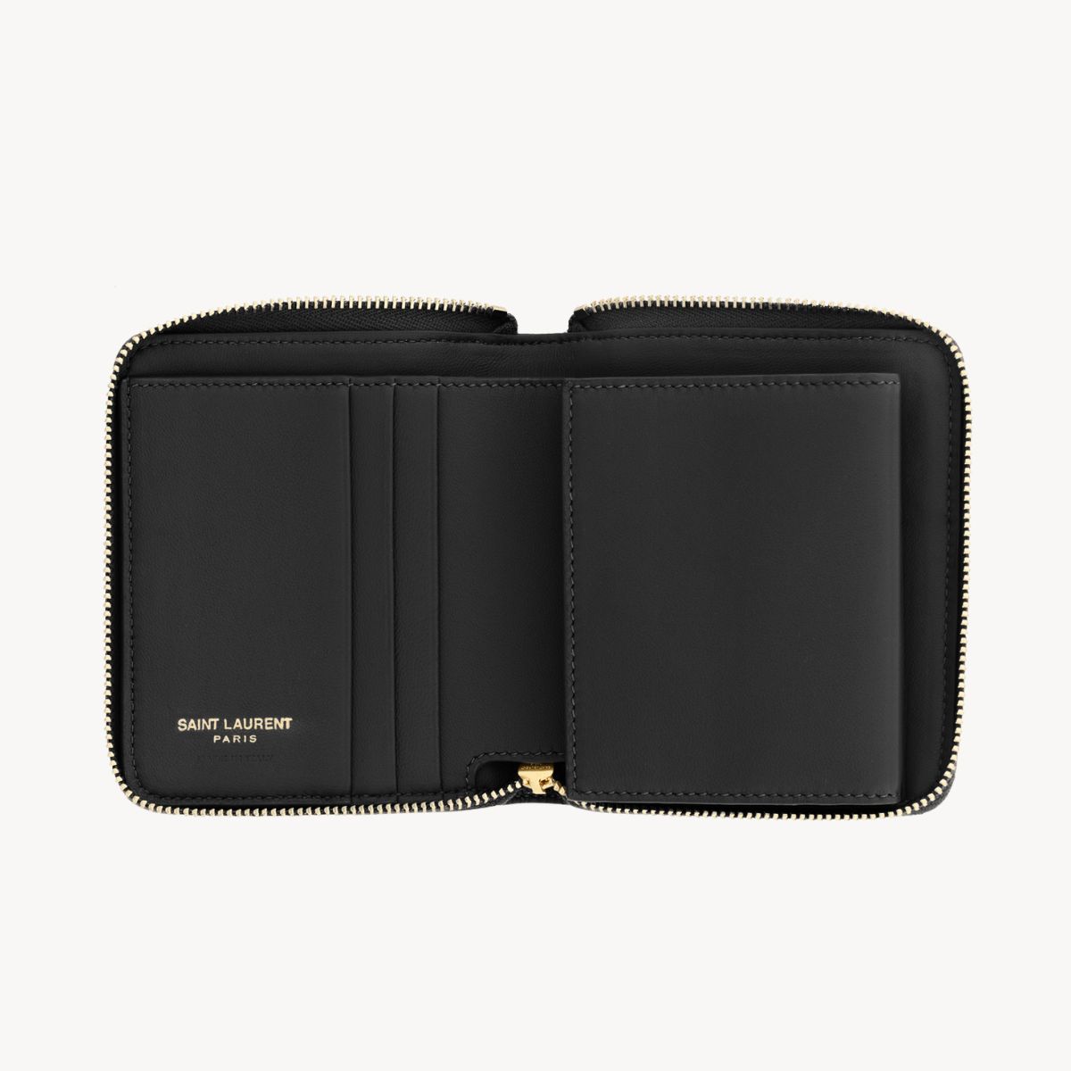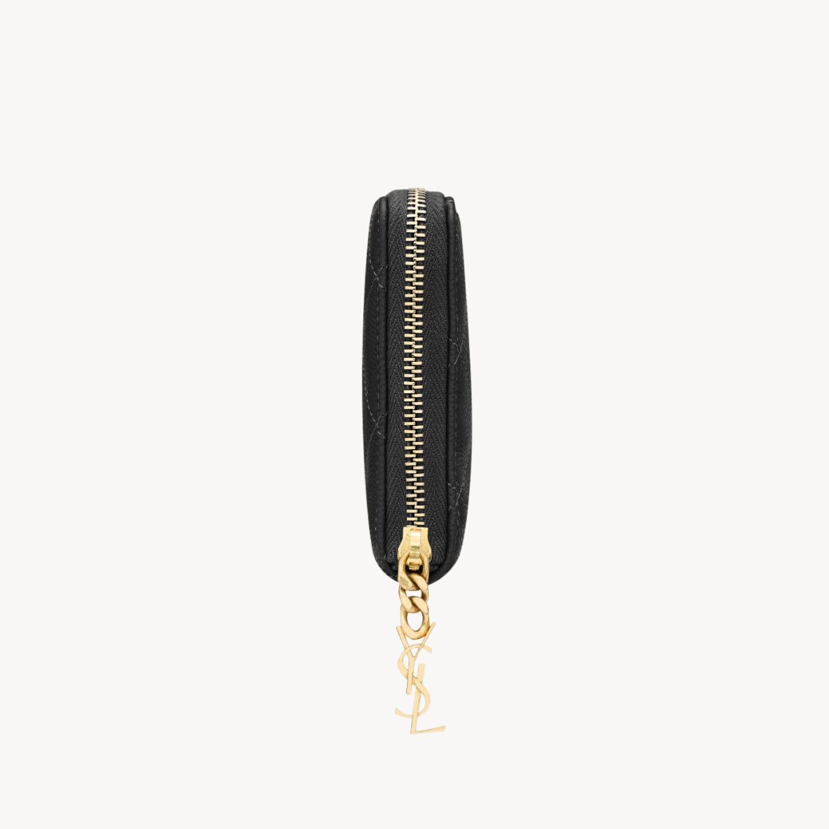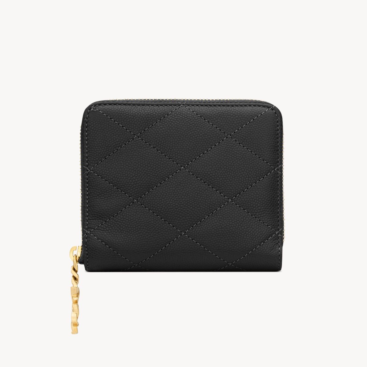 “YSL”のカサンドラロゴを象ったジュエリージッププルとダイヤモンドキルティングのトップステッチで仕上げられた、王道&リッチなブラック×ゴールドのミニウォレット。手に取るたびに上質さを実感できる、粒感のあるカーフスキンの風合いも魅力。傷の目立たないグレイン・ド・プードルレザーとシックなデザインで、長く寄り添ってくれる相棒に。