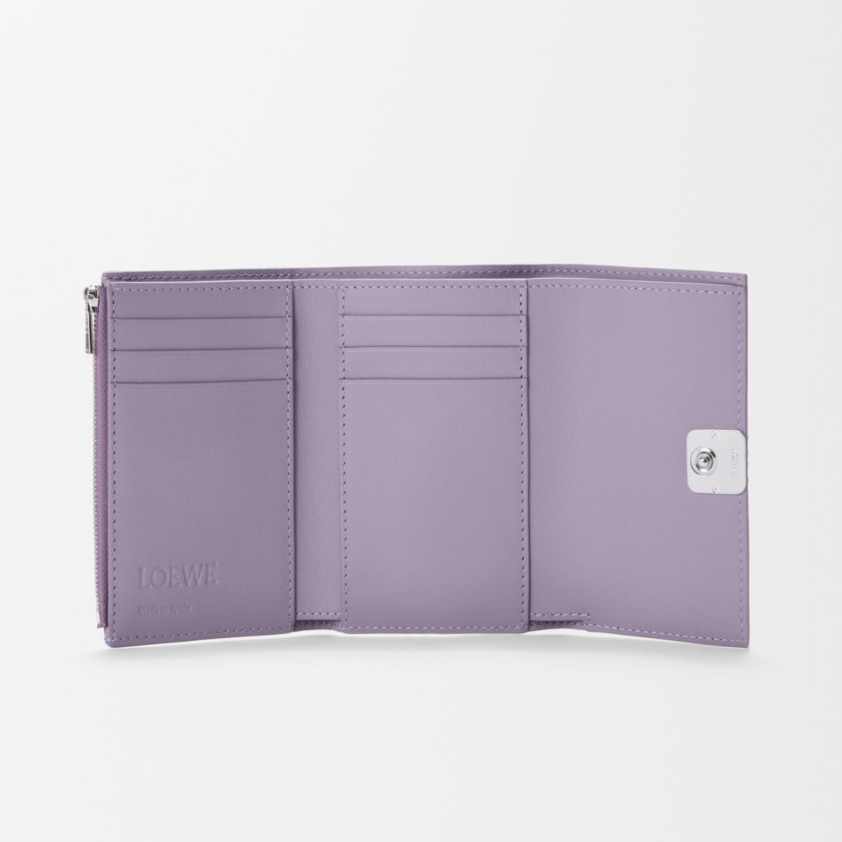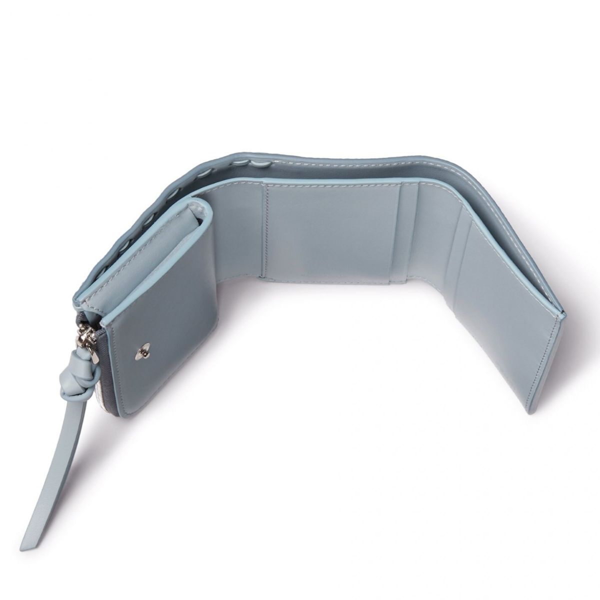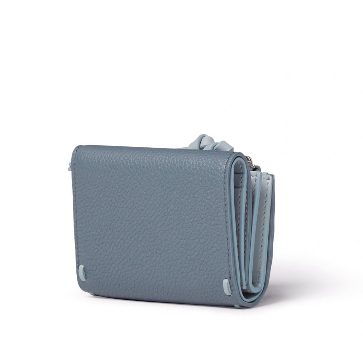 コンパクトな「ピーカブー」の三つ折り財布に大人可愛いブルーが登場。手作業で施されたレザーと同色の「セレリア」のステッチが、品の良いコントラストを放ちます。お札を折らずにしまえる札入れや、お財布を開かなくても使えるマチのあるL字ジップ付きコインパースが配されているので、現金派におすすめです。