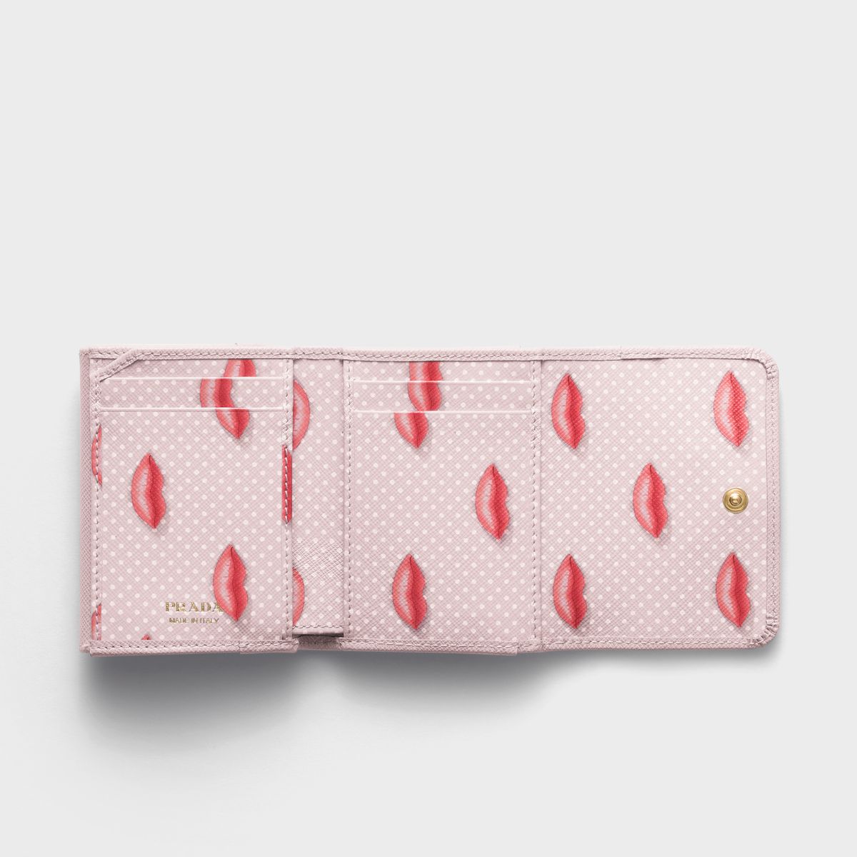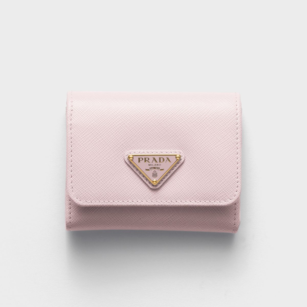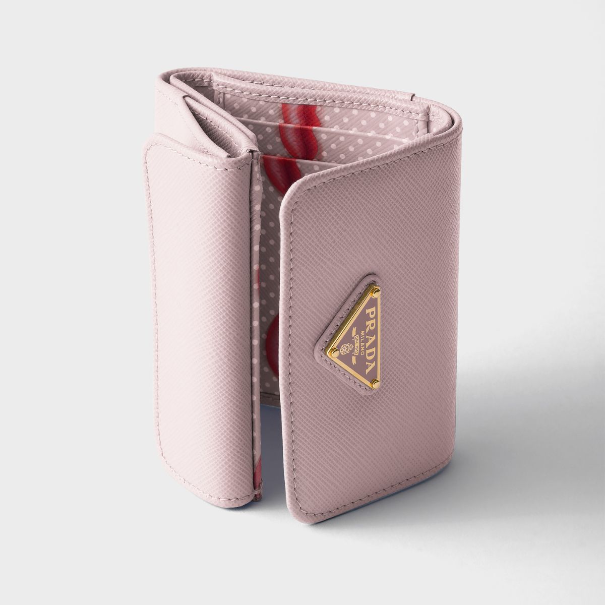 プラダのエレガンスが形となった上質なサフィアーノレザー(牛革)の三つ折りミニウォレット。優しい気持ちになれるソフトピンクと思いきや、内側にはアイコニックなリッププリント! 落ち込んだ気分の日も、財布を開くたびにポップな気分で自分を取り戻せるはず。