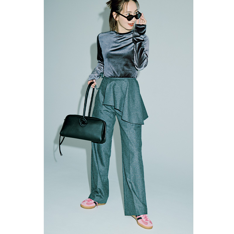 スニーカー/舞ちゃん私物 中に重ねた白タートルネック¥12,100〈アルアバイル〉ネイビータートルネック¥30,800〈ルル・ウィルビー〉(ともにアルアバイル)パンツ¥25,300(バッカ/ビー エディション ニュウマン新宿店)フードマフラー¥39,600グローブ¥13,200〈ともにロエフ〉バッグ¥77,000〈ブレディ フォー ロエフ〉(すべてエイチ ビューティー&ユース)靴下¥3,520(トウキョウ ウィークリー ジャーナル/バロックジャパンリミテッド)