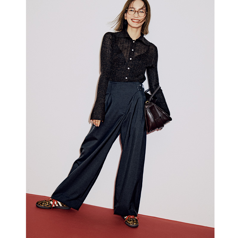 スニーカー/舞ちゃん私物 カーディガン¥44,000(コラム/エストネーション)パンツ¥31,900(エイチ ビューティー&ユース)眼鏡¥49,500(カーニー/ソスト)バッグ¥163,900(ネオアス/サロン アダム エ ロペ)イヤカフ¥15,400(ジュエッテ)靴下¥3,520(トウキョウ ウィークリー ジャーナル/バロックジャパンリミテッド)