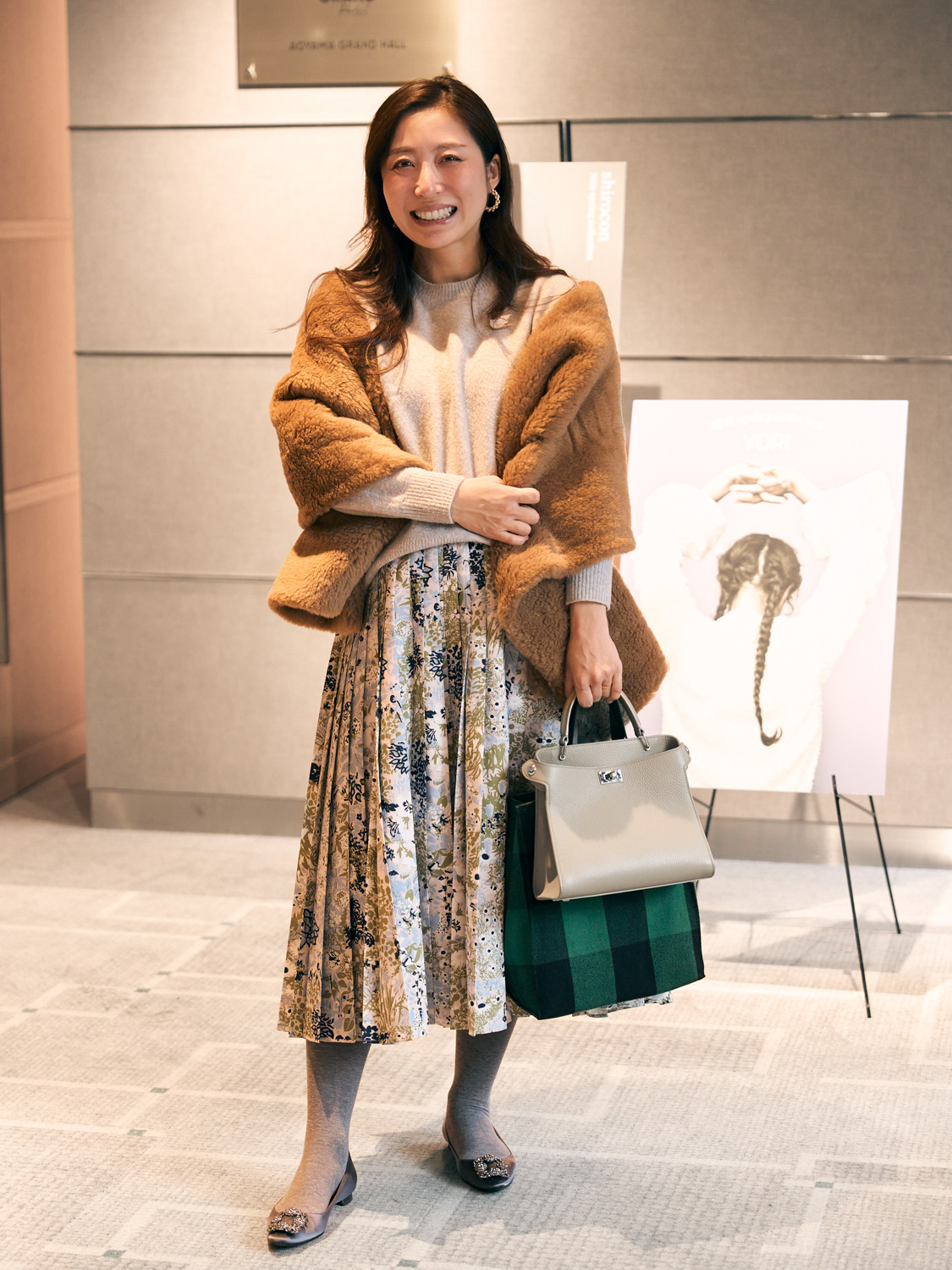 「体の変化にともなってお腹を締め付けないようにしつつも、だらしなく見えないような服選びをしています。どこかに明るい色をポイントで入れて、好きな服を着られないマタニティ期でも気分が上がるように。今日は着心地のいいスカートコーデに、モコモコのマルニのバッグを合わせて冬を意識しました」森下智子さん/会社員・152㎝(撮影時妊娠6カ月)