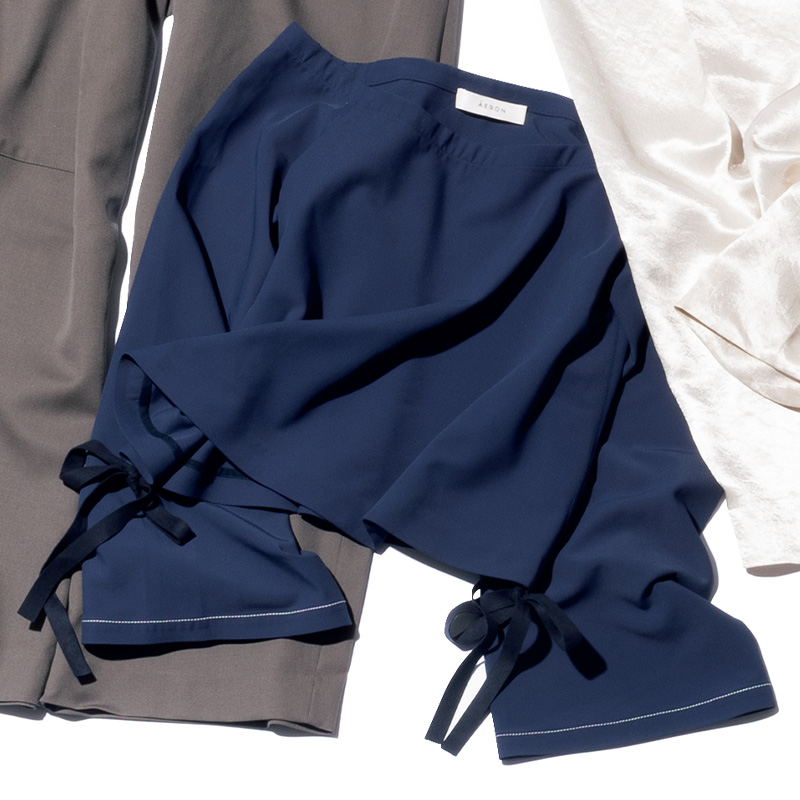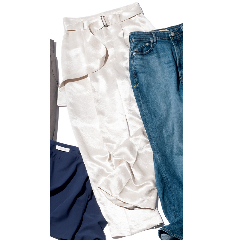 上品なサテンパンツはカジュアルトップスのバランサーに。