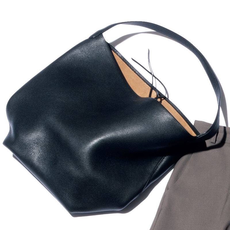 柔らか素材の大バッグなら、体にフィットして好バランスで持てる。