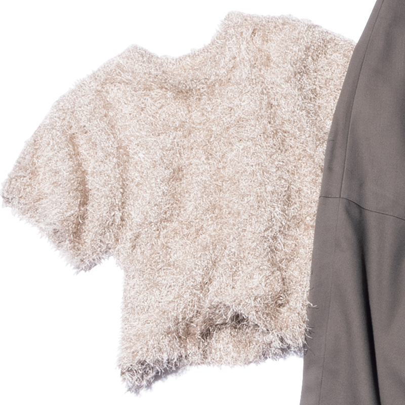 ワンツーでも決まる華やかな半袖ニット。思考レスの送迎の日に大活躍。
