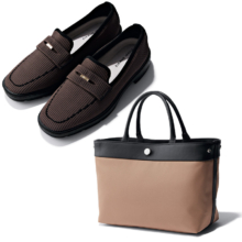 ローファー¥59,400(ピッピシック╱ベイジュ)ロゴソックス¥2,750(GREEN BUTTER╱ル タロン グリーズ ルミネ新宿店)ダウンジャケット¥41,800(メゾンスペシャル╱メゾンスペシャル 青山店)ニット¥49,500(スローン╱ザ ショップ スローン 新静岡セノバ店)デニムパンツ¥33,000(オブリオ)ピアス¥9,350(ソーク╱アンソロジー)バッグ¥152,900(トッズ╱トッズ・ジャパン)