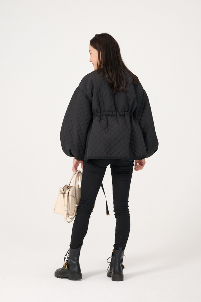 「ゆったりしたシルエットのキルティングコートですが、肩のラインがきれいに落ちるので、着膨れの心配がなく、ほどよい立体感を楽しめます。ママにとって心強い撥水加工がされていて、汚れをサッと拭けばある程度取れるので、雨の日や公園を挟むお迎えでも気兼ねなく着られます。中に何を着ていても一枚でサマになるから、バタバタな朝の送迎からママ友とのランチまで、冬の頼れる相棒になりそうです」髙橋香穂さん・31歳・主婦(163cm/4歳と6歳の女の子ママ)