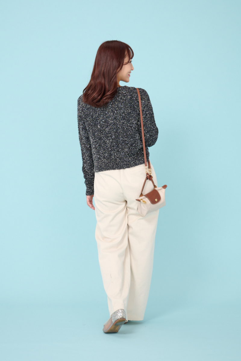 cardigan/[UNIVERSAL OVERALL]ラメニットカーディガン pants/Louere bag/Longchamp shoes/artemis by DIANA