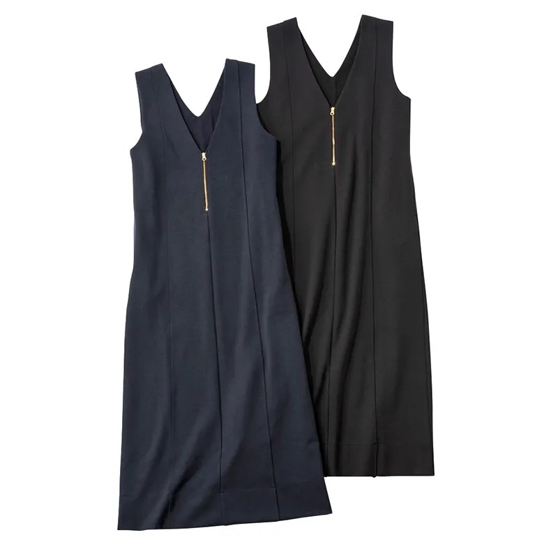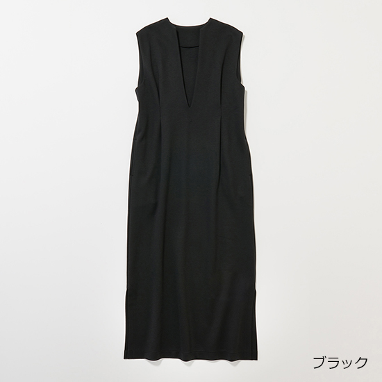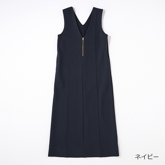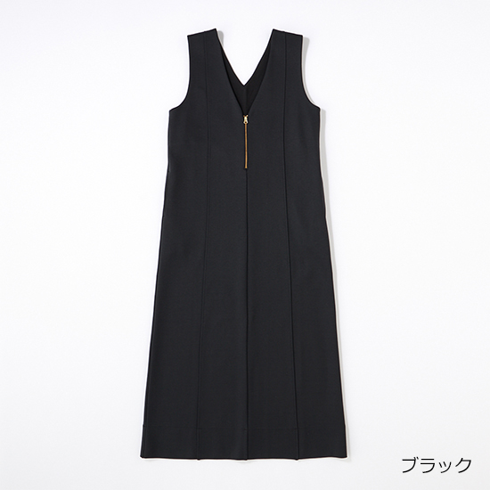 深Vやフロントに縦に3 本入れた切り替え線など、着痩せポイントがいっぱいのワンピ。やや上半身にゆとりがあるので、ニットをINに着ることも。ストレッチの効いたポンチ素材で、自宅で洗えちゃいます。ジップジャンパースカート¥22,000→¥11,000[50%off](スリースクエア)