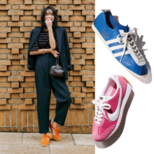 スニーカー¥36,300(OAO)シャツ¥63,800(ユナス/エストネーション)ベスト¥36,960(イウエン マトフ/ユナイテッドアローズ 渋谷スクランブルスクエア店)パンツ¥46,200(グリードインターナショナル)ジャケット¥41,800(プランクプロジェクト/プランクプロジェクト 青山店)イヤリング¥28,600バングル¥48,400(ともにセシル・エ・ジャンヌ/セシル・エ・ジャンヌ 青山店)バッグ¥185,900(トッズ フォー ロンハーマン/ロンハーマン)ソックス¥3,630(ロイヤリティーズ/ユーロファッションジャパン)