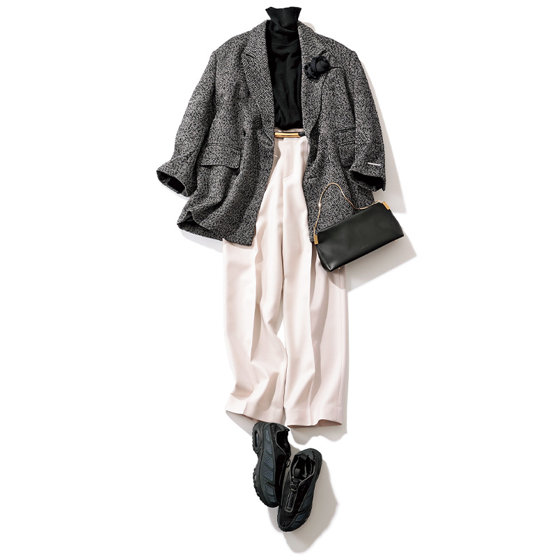 スニーカー¥28,050(ナイキ スポーツウェア/NIKE カスタマーサービス)ジャケット¥41,800(プランクプロジェクト/プランクプロジェクト 青山店)ジャケットにつけたコサージュ¥24,200(デ・プレ)ニット¥19,800(ノーク)パンツ¥35,970(イウエン マトフ/ユナイテッドアローズ 渋谷スクランブルスクエア店)ベルト¥22,000※参考価格(アトリエ アンボワーズ/アマン)バッグ¥75,900(マエストソ/アマン)