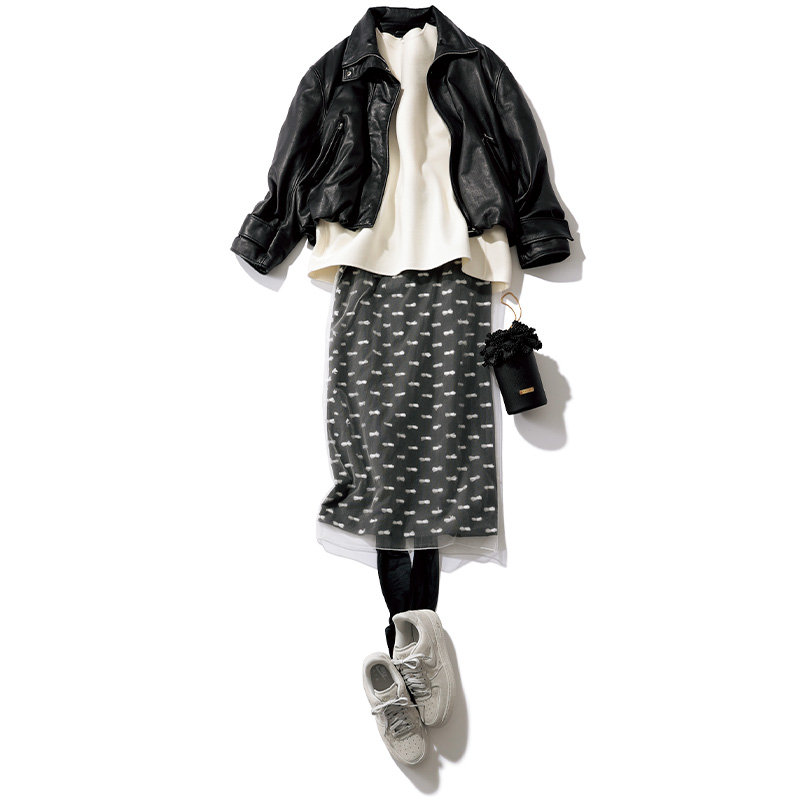 スニーカー[エア フォース 1]¥16,500 (ナイキ スポーツウェア/NIKE カスタマーサービス)レザージャケット¥52,800(プランクプロジェクト/プランクプロジェクト 青山店)プルオーバー¥40,700(HER.)スカート¥30,000(シーニュ)バッグ¥85,800(ヴァニーナ/ルル・ウィルビー/アルアバイル)タイツ/スタイリスト私物