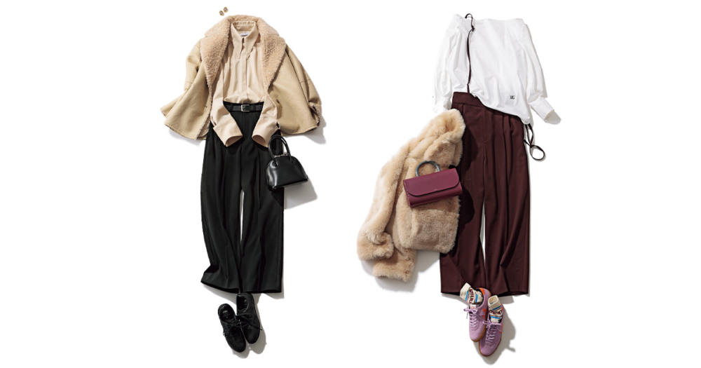 「おしゃれを気兼ねなく楽しめる貴重な機会には、オフショルブラウスやファーブルゾンなどパンチ力のあるアイテムで挑みたい!ラインソックスを仕込んだスニーカーでカジュアル感と色を効かせば、品よく高感度なおしゃれに」