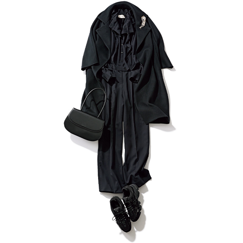 スニーカー[M1000]¥19,800(ニューバランス/ニューバランスジャパンお客様相談室)コート¥149,600(コンテ/コンテ青山店)オールインワン¥46,970(イウエン マトフ/ユナイテッドアローズ 渋谷スクランブルスクエア店)バッグ¥121,000(メゾンヴァジック/ヴァジックジャパン)ブローチ¥13,200(アルアバイル)