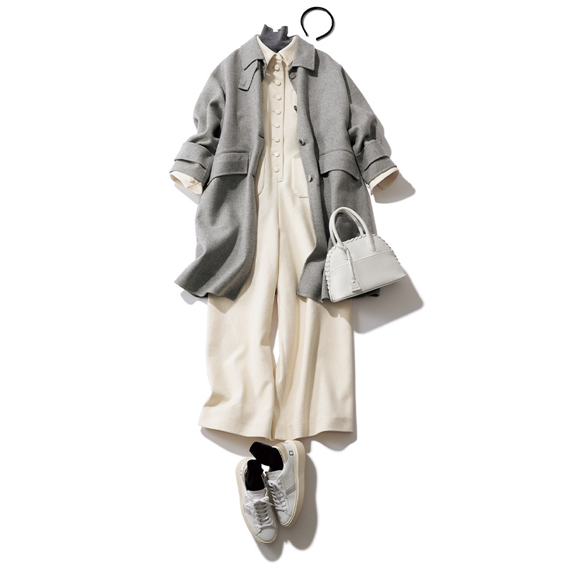 スニーカー¥39,600〈デイト〉オールインワン¥79,200〈ルル・ウィルビー〉(ともにアルアバイル)タートルニット¥66,000(エストネーション ザ ファースト/エストネーション)コート¥264,000(マッキントッシュ/マッキントッシュ 六本木ヒルズ店)カチューシャ¥19,800(アレクサンドル ドゥ パリ/アレクサンドル ドゥ パリ GINZA SIX店)バッグ¥104,500(メゾンヴァジック/ヴァジックジャパン)ソックス¥2,200(マルコモンド)